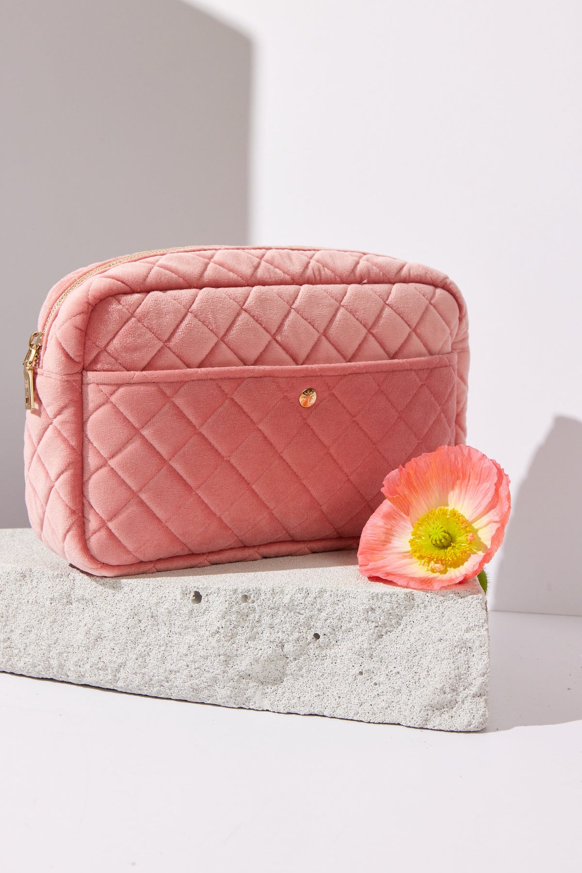 Toilettas van Fan Palm van zacht velours met een gequilt oppervlak. De roze tas heeft zowel een groot hoofdvak als een praktische buitenzak.