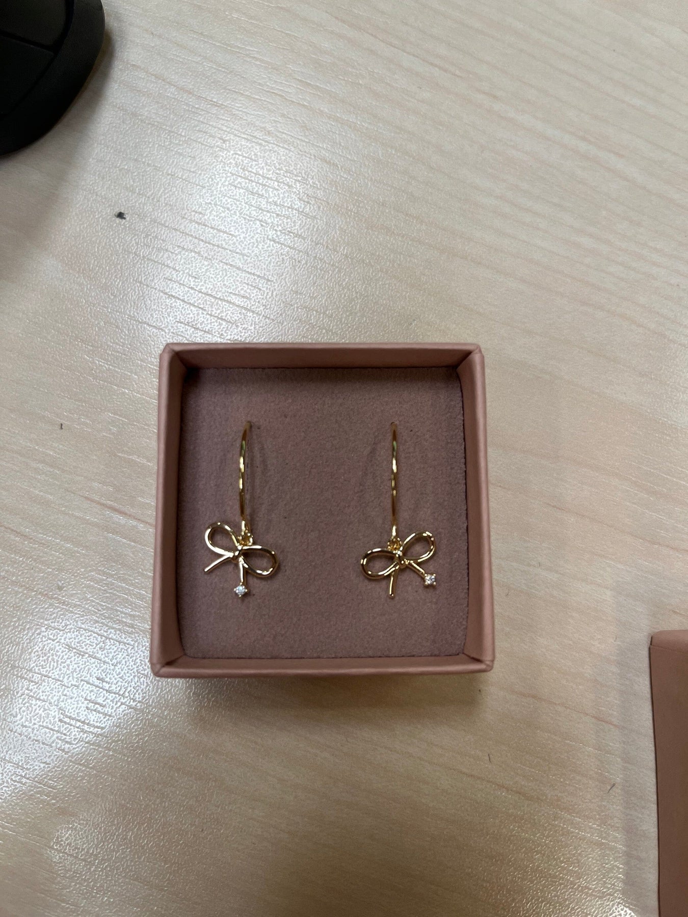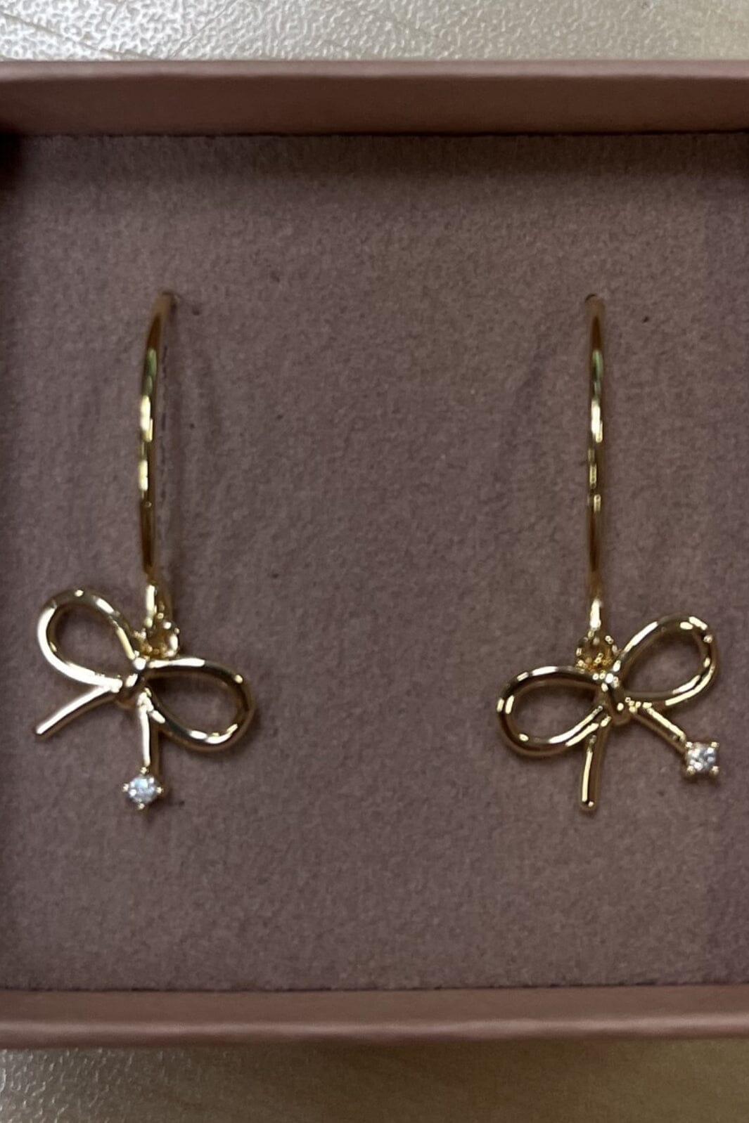 Vergulde oorbellen in strikvorm met een kleine glinsterende hanger. Het ontwerp heeft een gebogen creolenvorm en een glanzend oppervlak.