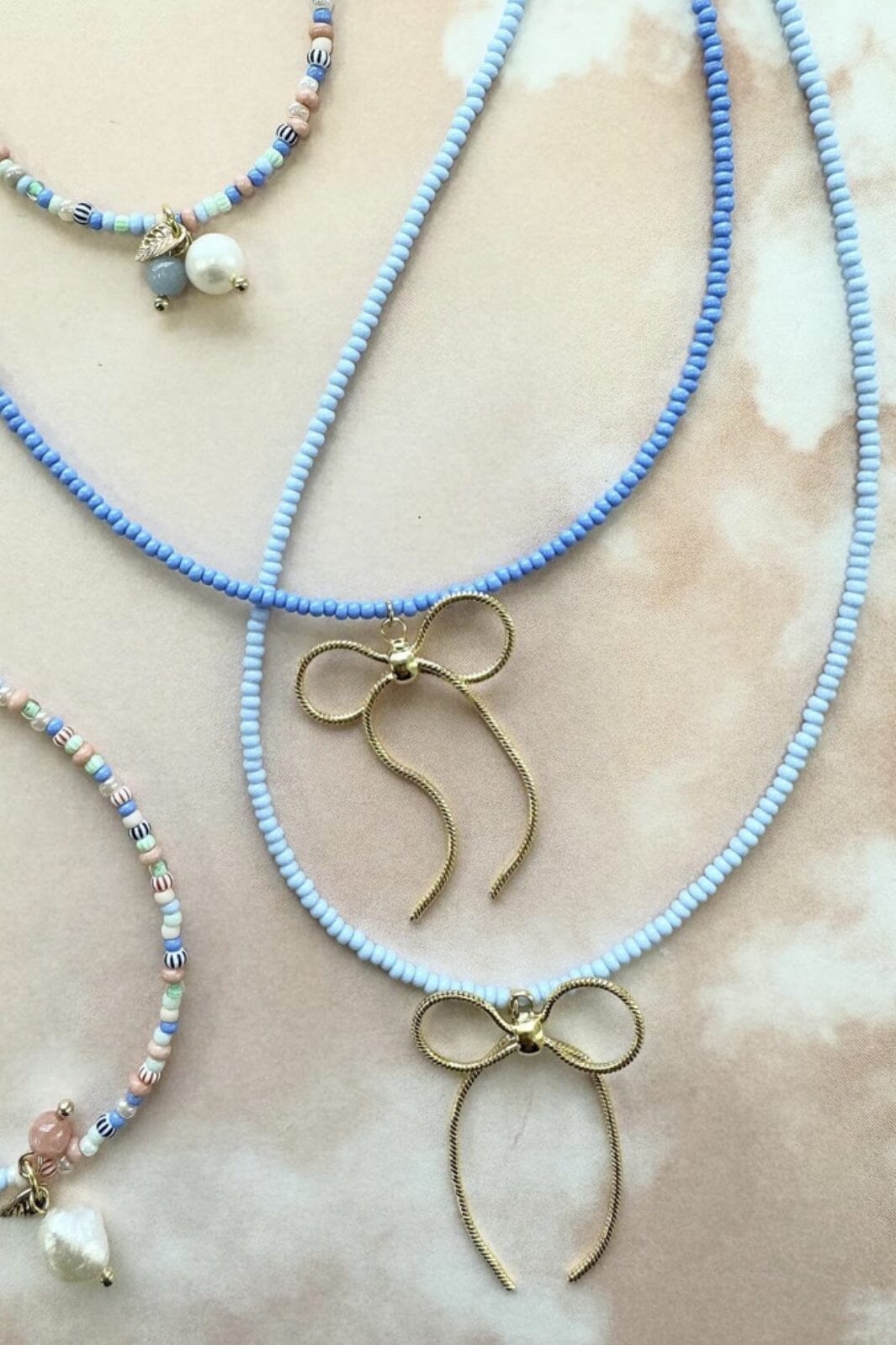 Een ketting met een strikvormig hanger in goudkleurig metaal. De lichtblauwe parels lopen helemaal rond de ketting en creëren een mooie contrast.