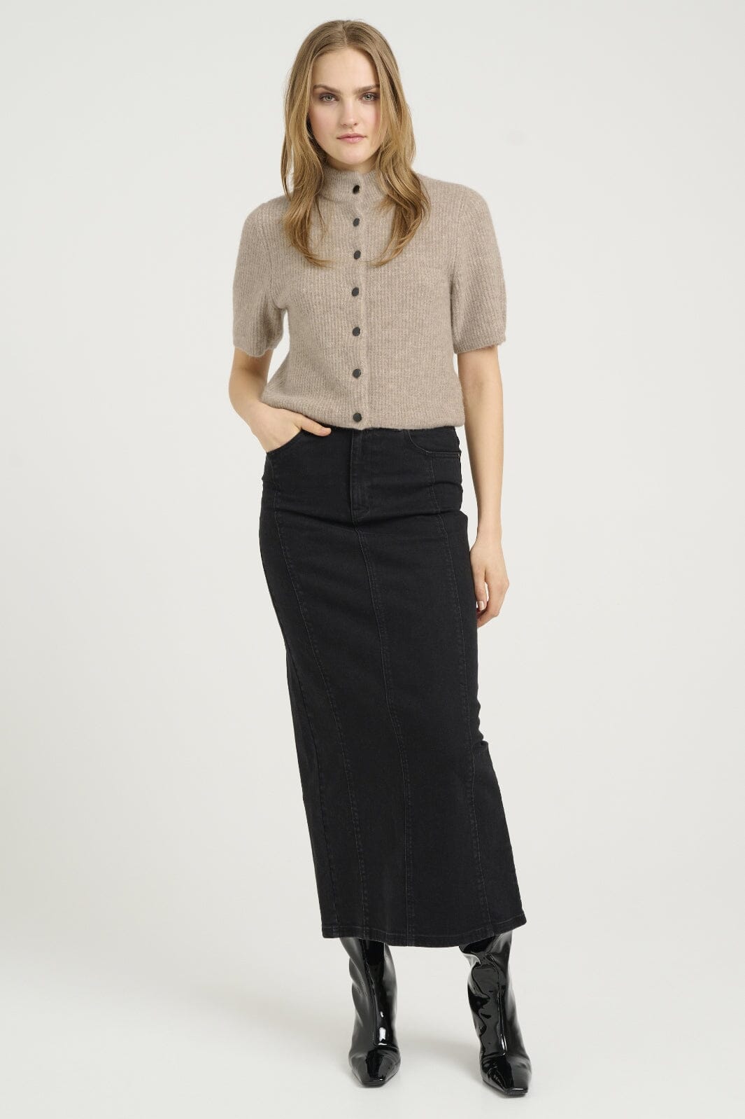 Korte cardigan van Gestuz in warme zandkleurige melange. Hij heeft een hoge hals en korte mouwen met een rij zwarte knopen aan de voorkant. De brei heeft een zachte textuur en regular fit.