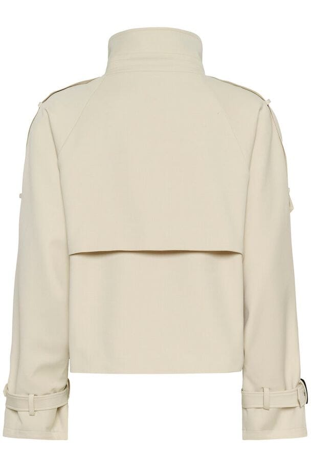 Korte trenchcoat van Gestuz in een beige kleur. De jas heeft een dubbelrijig design met grote zwarte knopen en gespdetaillering bij de kraag en mouwen.