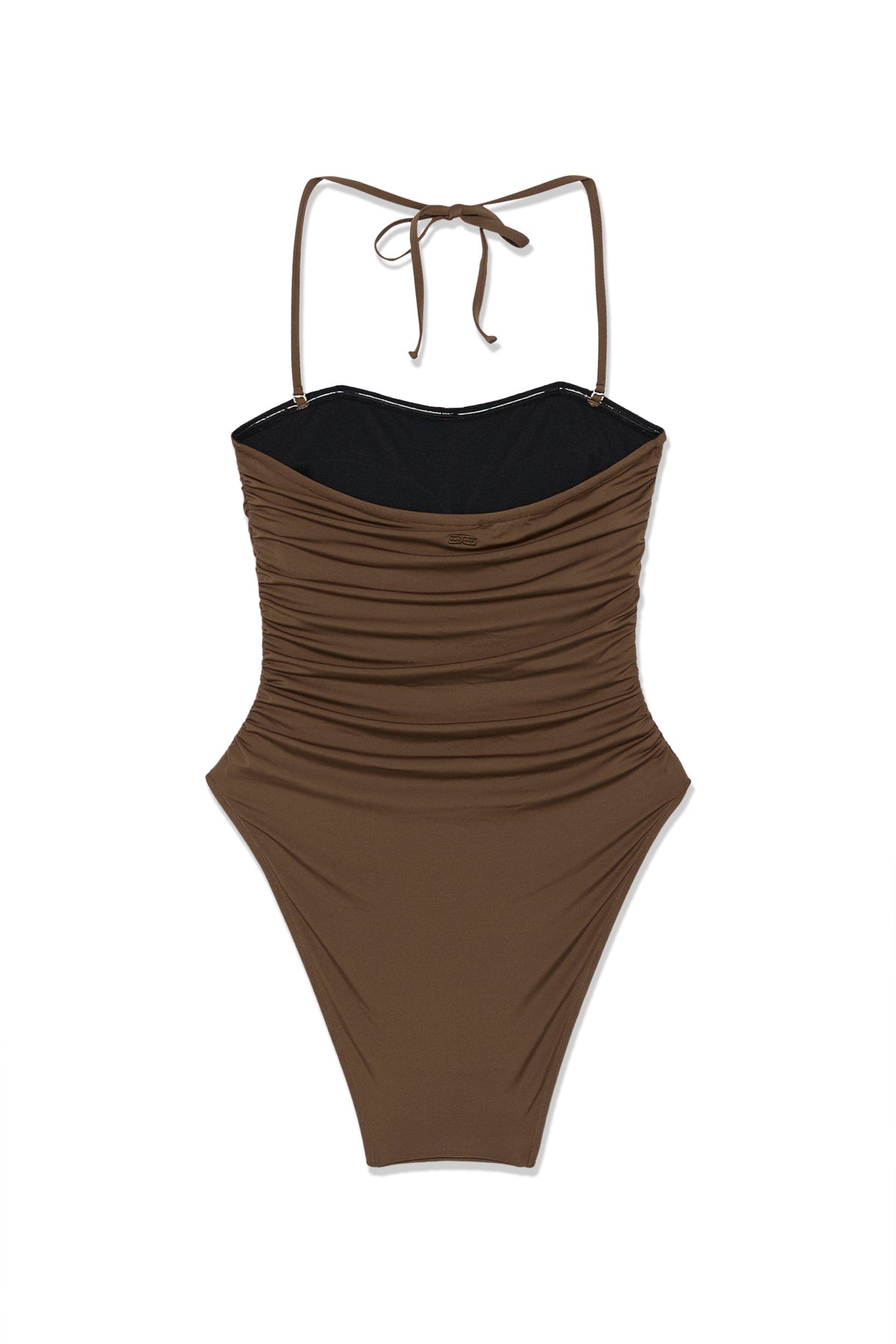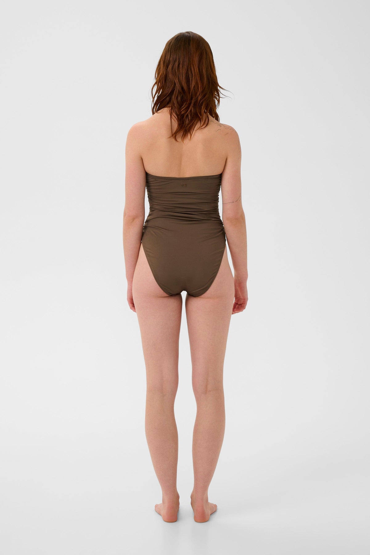 Bruin badpak van Gestuz, ontworpen voor zowel actieve momenten als ontspannen uurtjes. Het badpak heeft een geplooid design met smalle bandjes en strikdetails.