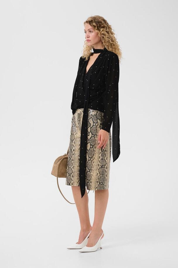 Blouse van Gestuz in donker kaki met kleine lichte stippen. De blouse is gemaakt van 100% gerecycled polyester en heeft strikdetails.