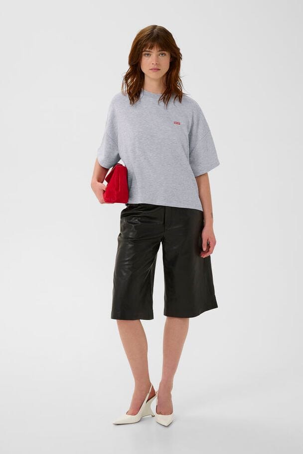 Gemêleerd sweat-T-shirt van Gestuz in een ultralichte grijs gemêleerde tint. Het heeft een oversized pasvorm en korte mouwen met een klein rood logo op de borst.