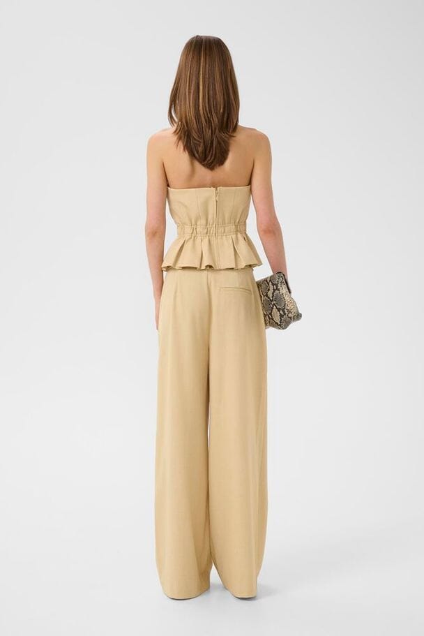 Straploze top van Gestuz in een licht beige melangekleur. De top heeft een peplum-effect aan de onderkant en verticale naden.