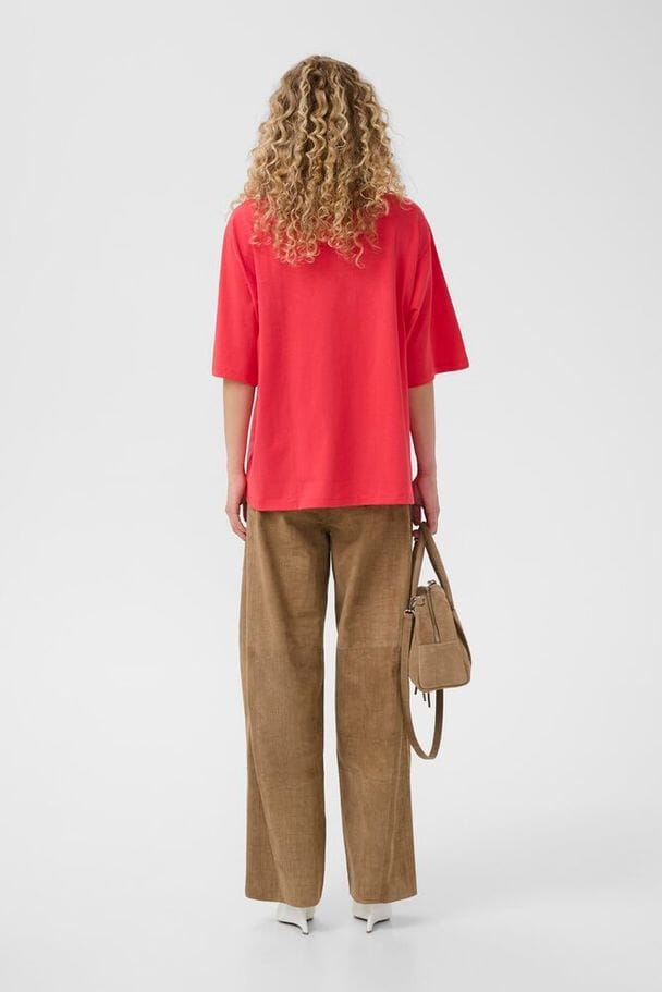 T-shirt van Gestuz in een rode tomaatkleur. Hij heeft een oversized pasvorm en is gemaakt van biologisch katoen met een subtiele borduursel op de borst.