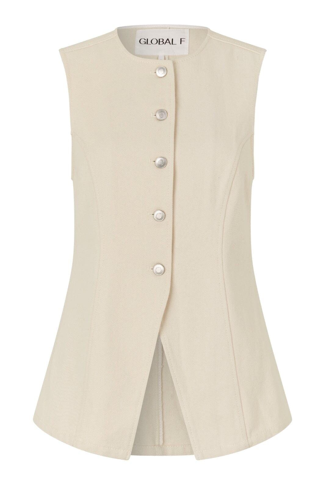 Mouwloze vest van Global Funk in een lichte ecru-kleur. De vest heeft een ronde hals, knopen aan de voorkant en decoratieve stiksels die een schone en eenvoudige uitstraling geven.