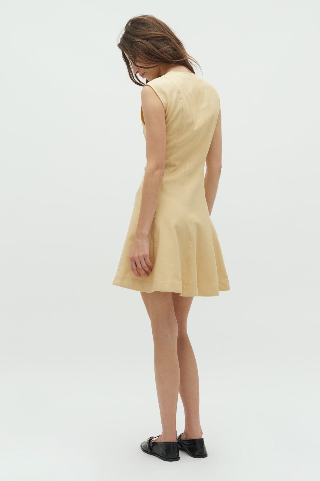 Korte jurk van Global Funk in een lichtgele gemêleerde kleur. De jurk heeft een V-hals en knopen aan de voorkant. Hij is gesneden op kniehoogte met een A-lijn silhouet en korte mouwen.
