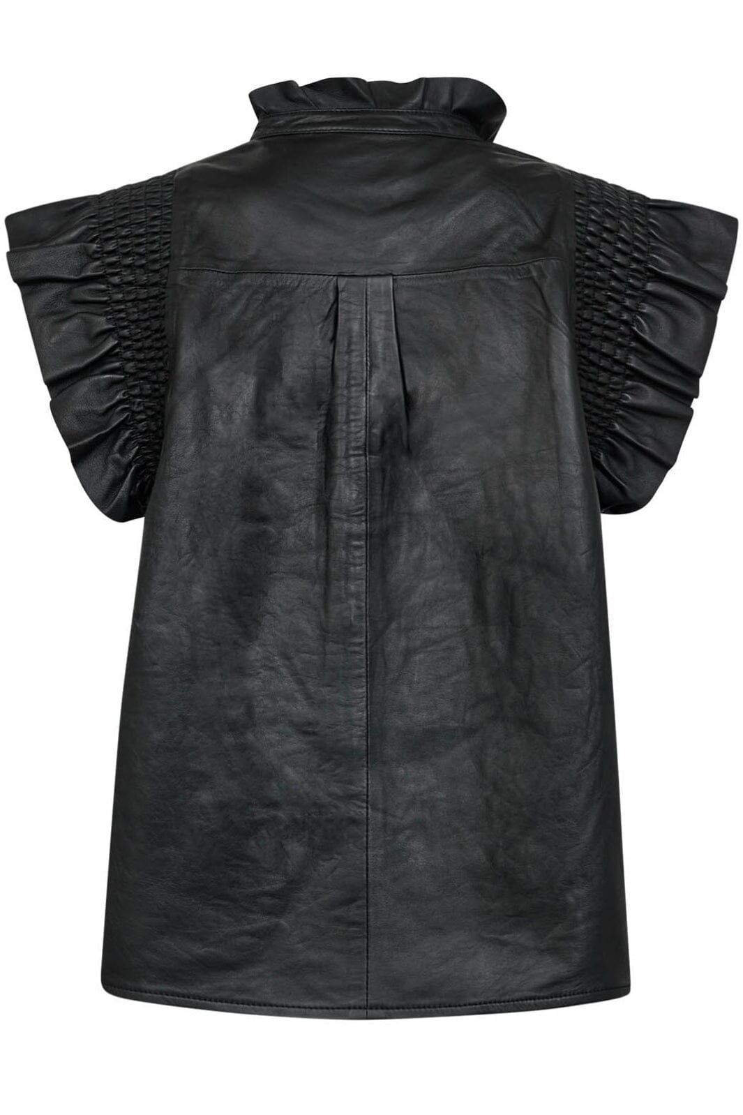 Zwarte blouse van Gossia van lamsleer met geplooid ontwerp op de rug. De blouse heeft korte mouwen met ruches en een klassieke blousekraag met knoopsluiting aan de voorkant.