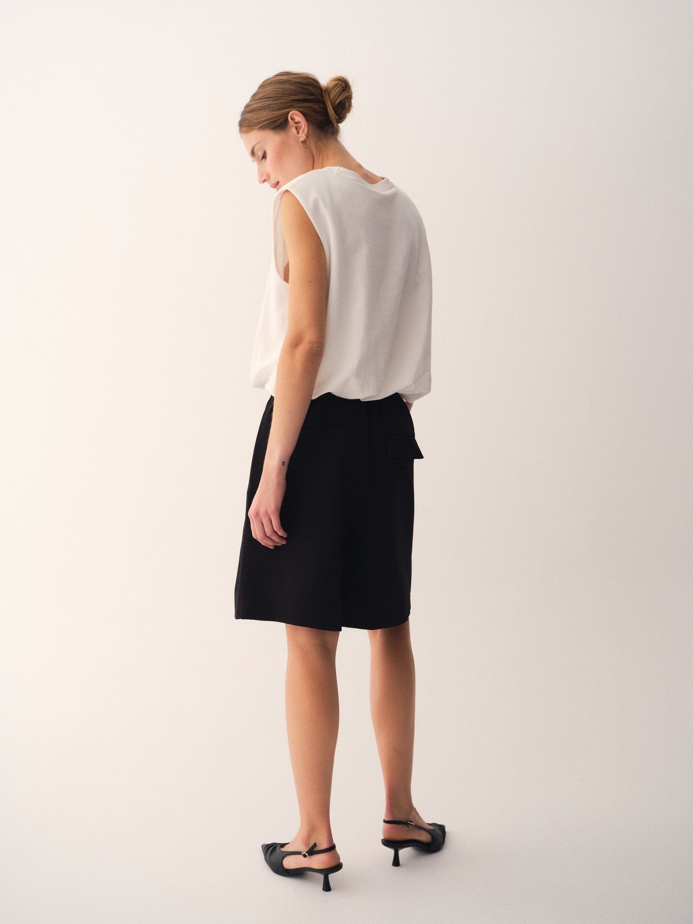 Zwarte shorts van Gossia met geplooide voorkant en logo op de taille. De shorts hebben een klassieke bovenbeenlengte en een effen zwarte oppervlakte.