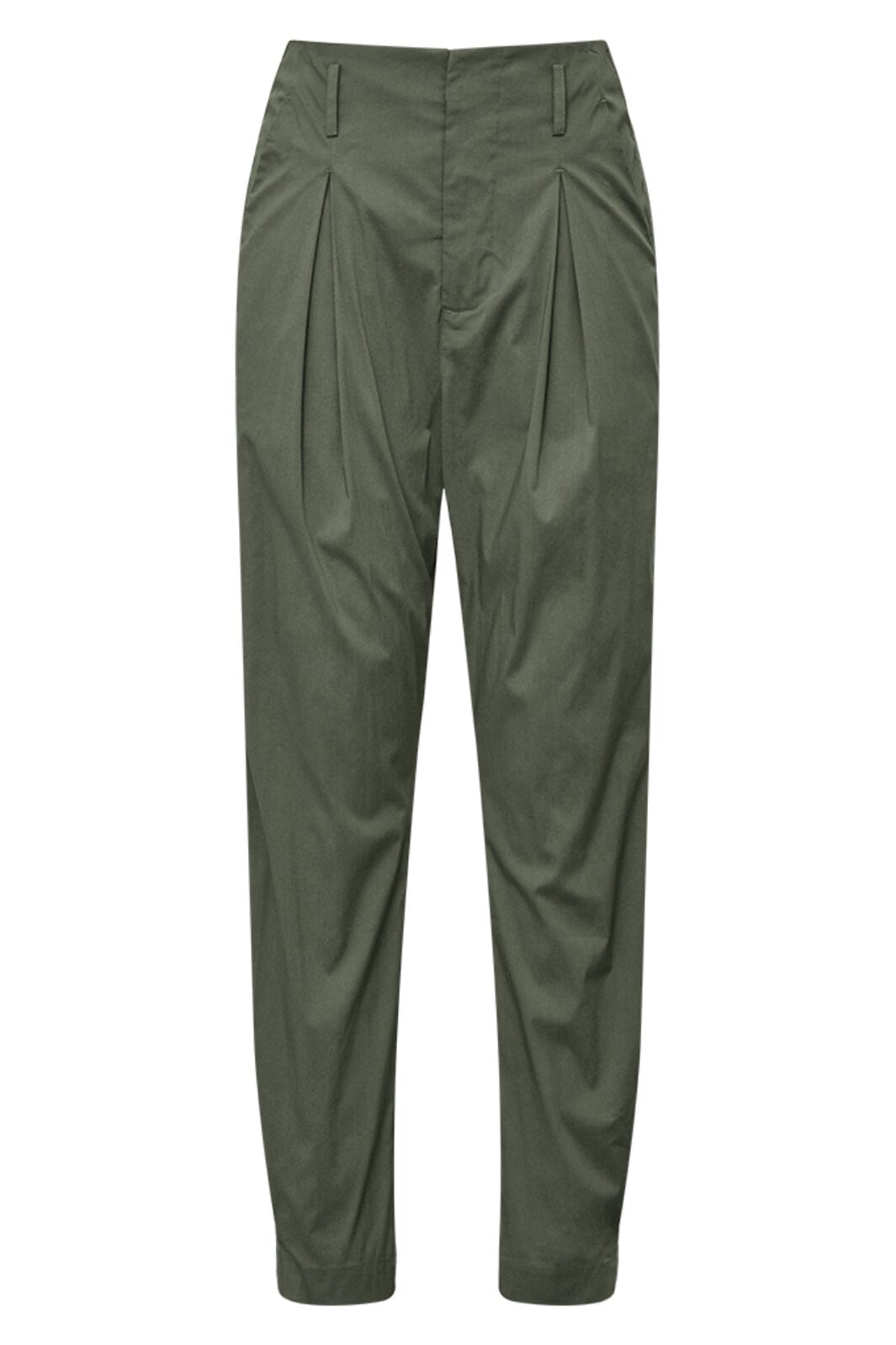 Olijfgroene broeken van Gossia met plooien aan de voorkant en schuine zakken. De broeken hebben een relaxte pasvorm met wienerplooien en kunnen zowel hoog- als laag in de taille worden gestyled.