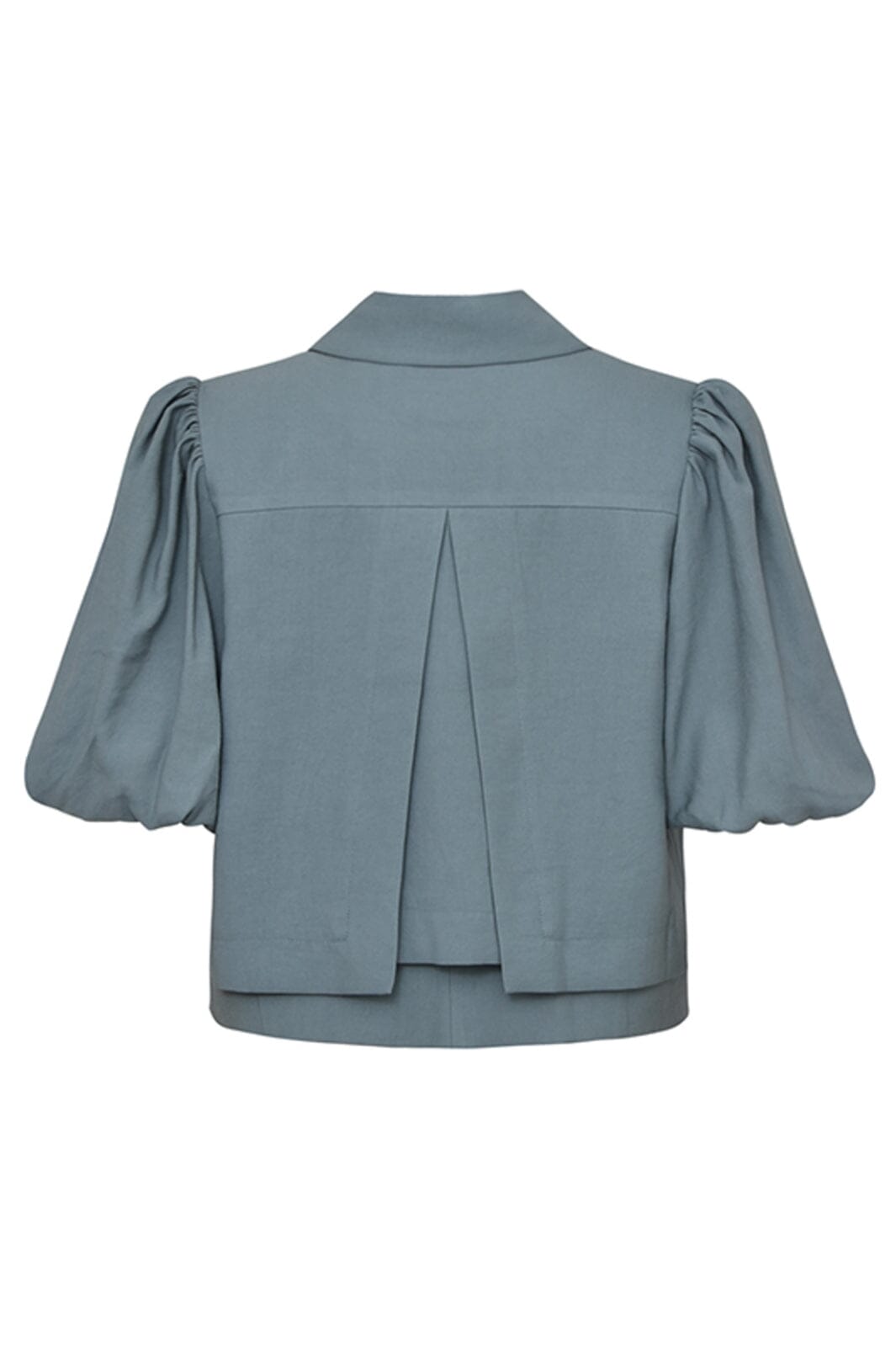 Korte jas van Gossia in een lichtblauwe tint. De jas heeft pofmouwen en een dubbelgeknoopte ontwerp met V-hals.