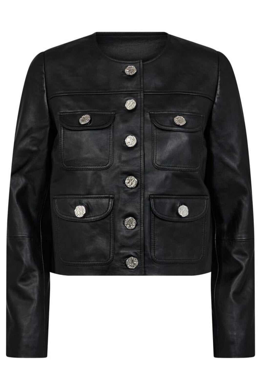 Zwarte leren jas van Haute L'Amitié van zacht lamsleer. De jas heeft een ronde hals, lange mouwen en decoratieve zilveren knopen die een markante uitstraling geven.