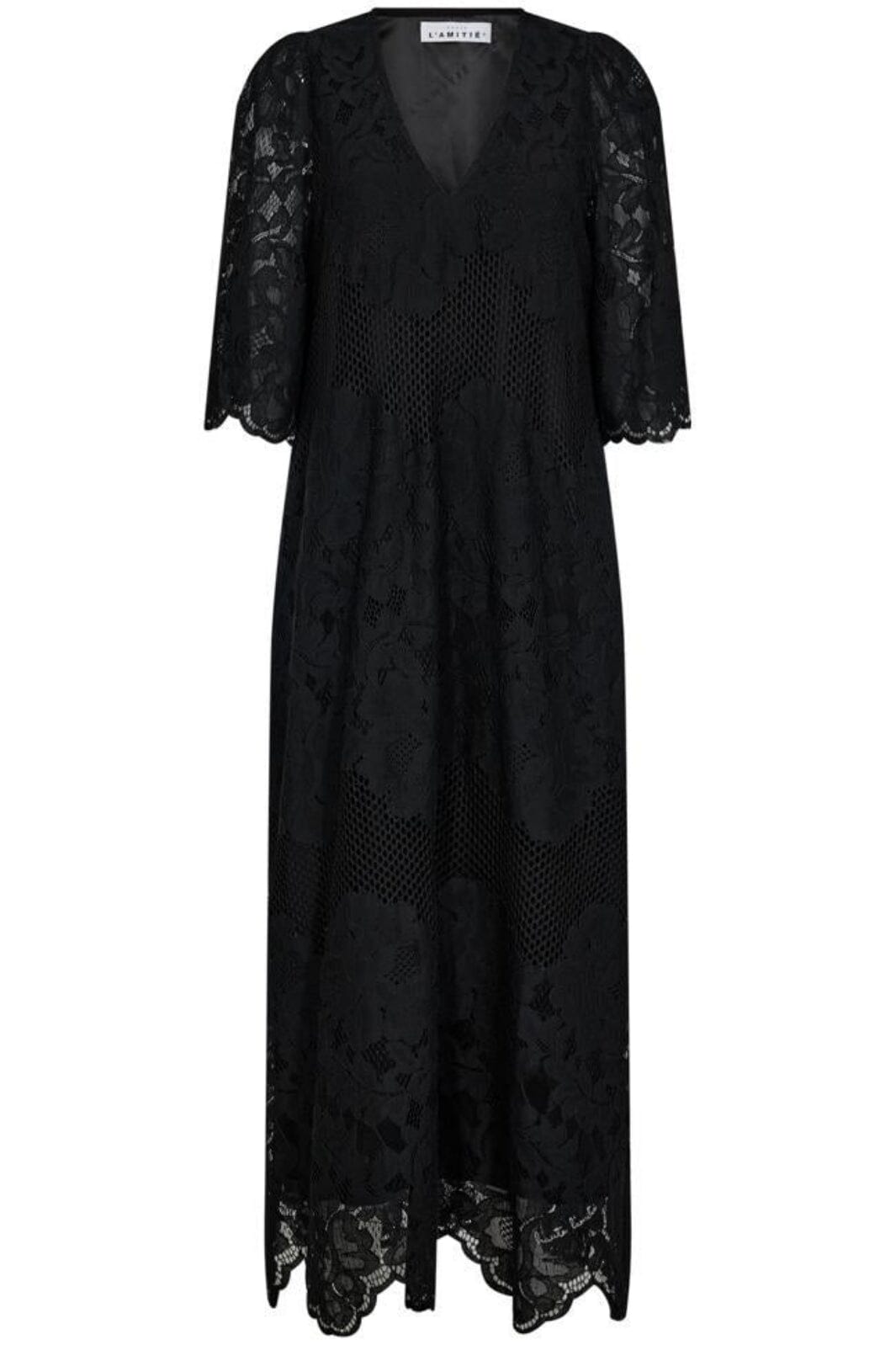 Zwarte kanten jurk in enkelengte met V-hals. De jurk heeft driekwart mouwen en een kanten rand die helemaal om de jurk heen loopt.
