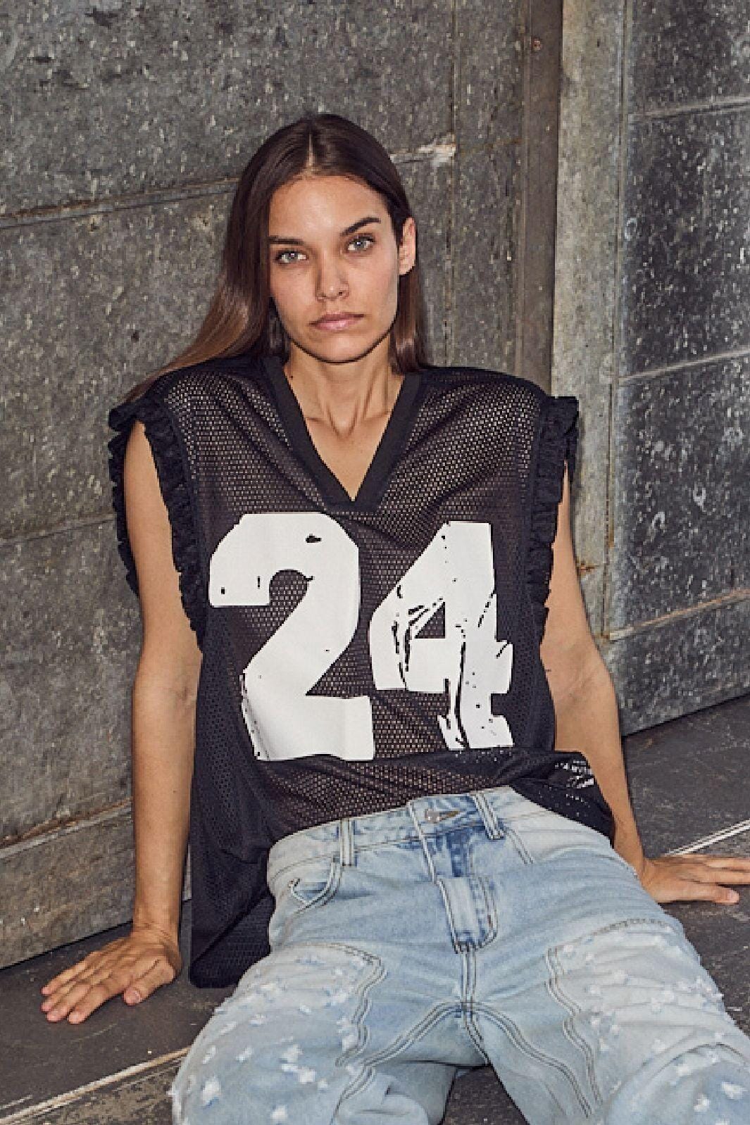 Zwart topje van Haute L'Amitié met netstructuur en witte 24-print op de voorkant. De top heeft een V-hals en ruchesdetails op de schouders.