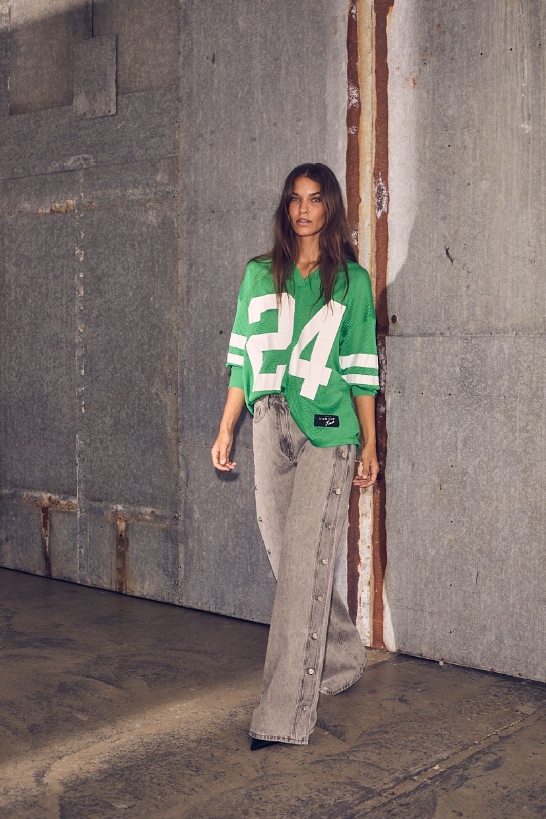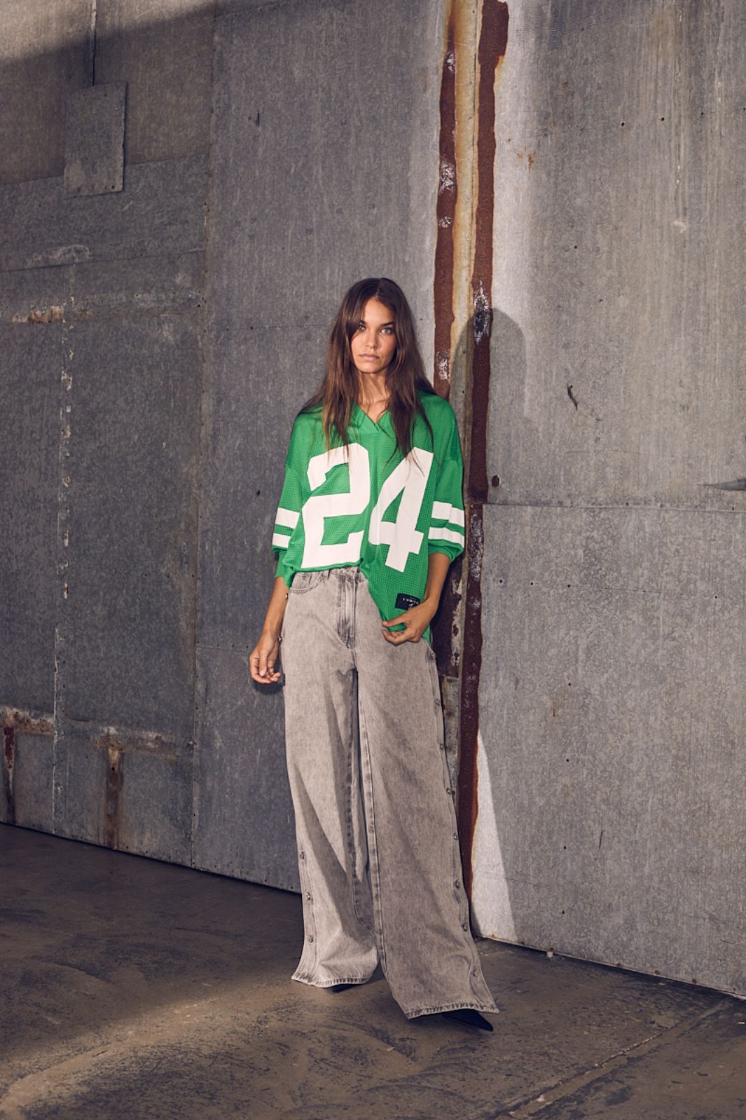 Groene langarm t-shirt van Haute L'Amitié met mesh-design. Het t-shirt heeft een oversized pasvorm en een groot nummer 24 op de voorkant samen met witte strepen op de mouwen.
