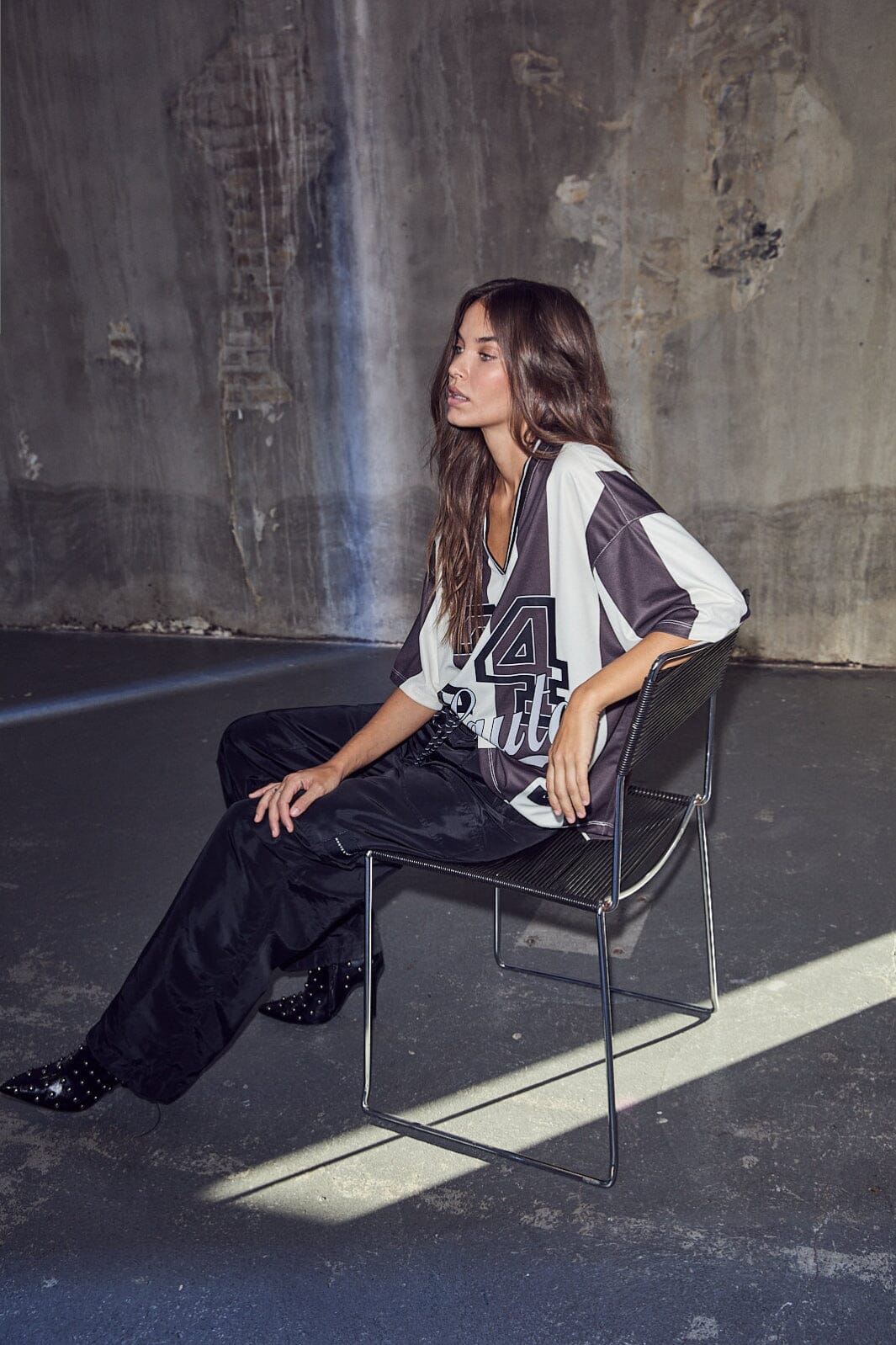 Gestreepte blouse van Haute L'Amitié in bruin en crèmekleur. De blouse heeft brede verticale strepen en een grote 24-print aan de voorkant.