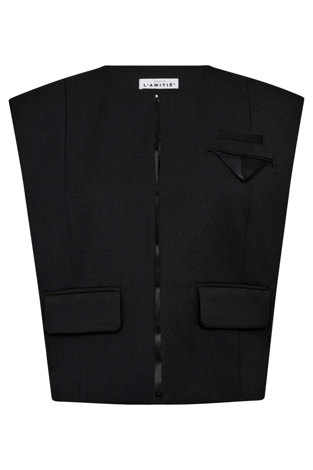 Zwarte vest van Haute L'Amitié met een minimalistisch ontwerp. De vest heeft een strakke silhouet met praktische zakken aan de voorkant en een goede pasvorm.