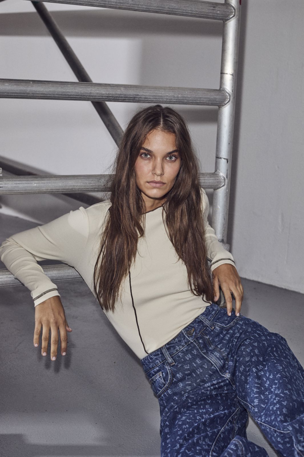 Blouse van Haute L'Amitié in een lichte beige tint. De blouse heeft zichtbare contrastnaden en een geribde structuur met lange mouwen en een ronde hals.