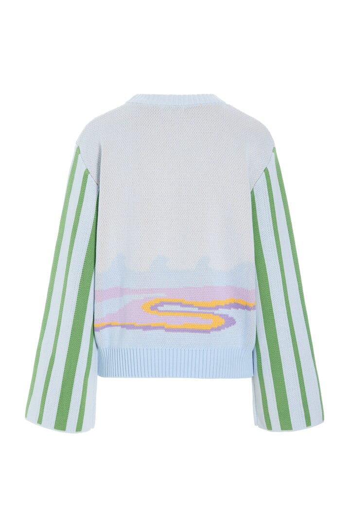 Blouse van Hunkøn in de kleur Blue Sea. Hij heeft een geborduurd motief met zon en boot op de voorkant en verticale strepen op de mouwen.