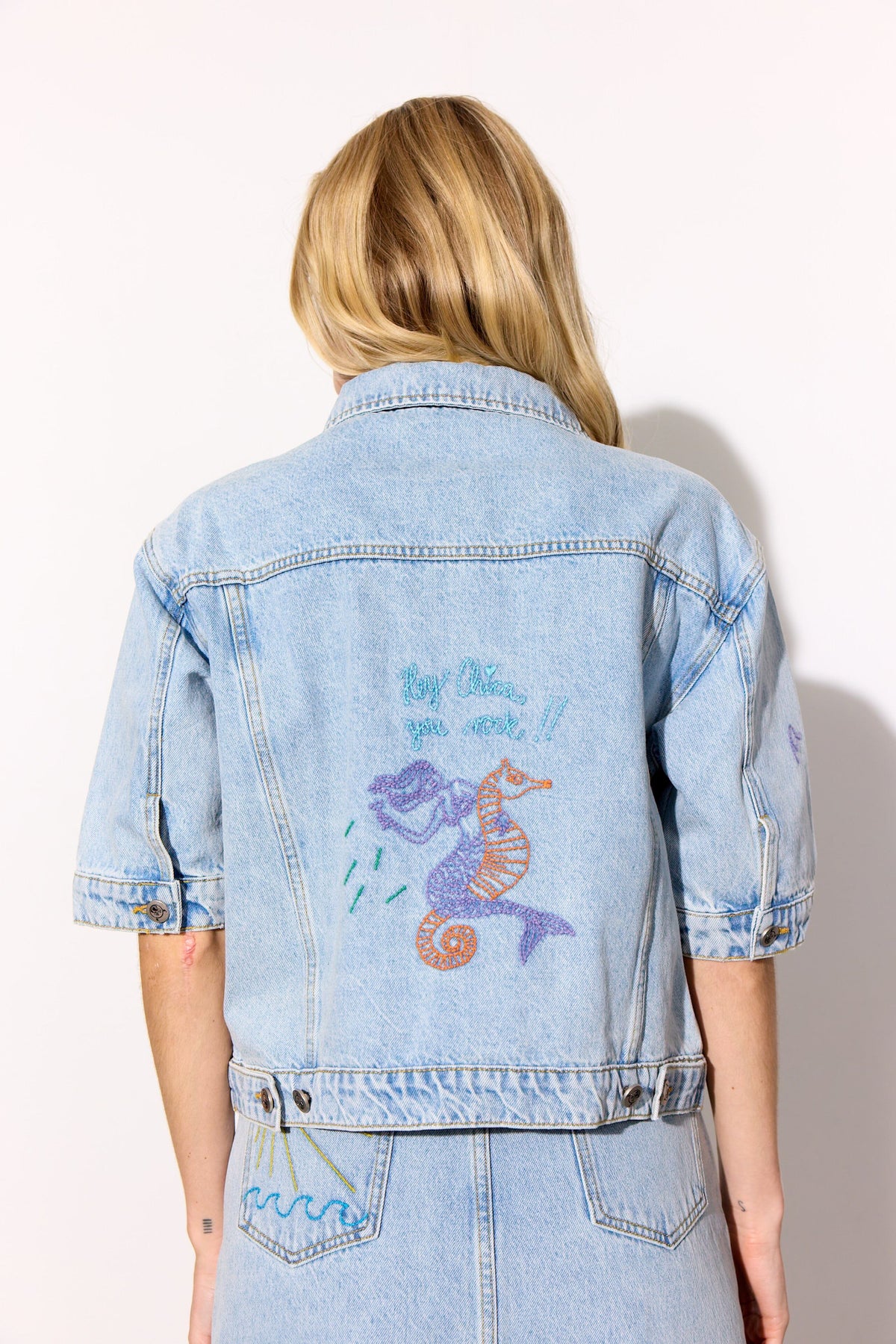 Denimjack van Hunkøn in licht denim met geborduurde motieven en golven op de voor- en achterkant. Het jack heeft een losse pasvorm en korte mouwen.