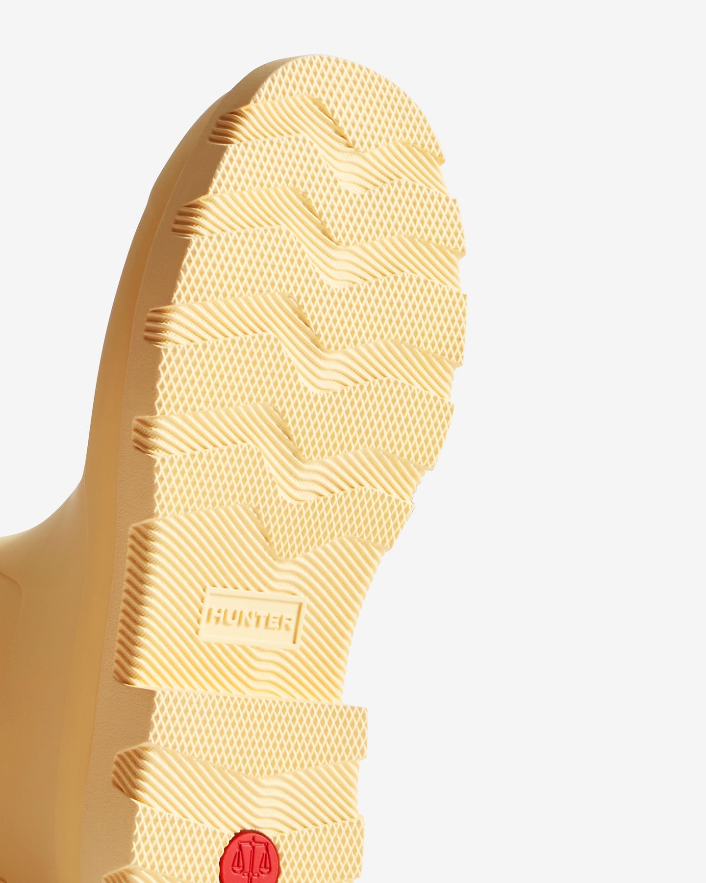 Korte rubberlaarzen van Hunter, gemaakt van 100% rubber in een lichtgele kleur. De laarzen hebben een eenvoudig design met het zichtbare Hunter-logo aan de voorkant.