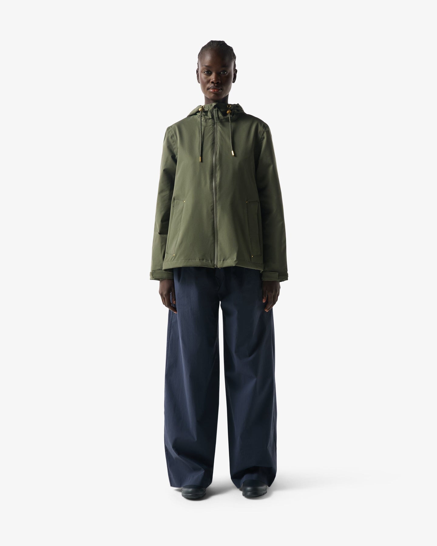 Waterdichte jas van Hunter, uitgevoerd in kaki groen. De jas heeft een capuchon met verstelbaar trekkoord en een ritssluiting aan de voorkant.