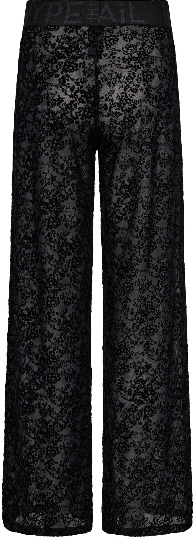 Zwarte kanten broek van Hype The Detail met een bloemmotief over de hele stof. De broek heeft wijde pijpen en een elastische tailleband.