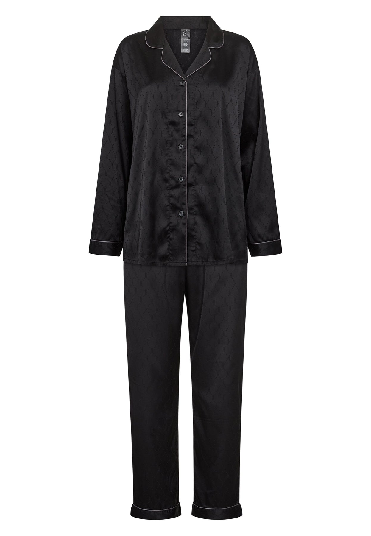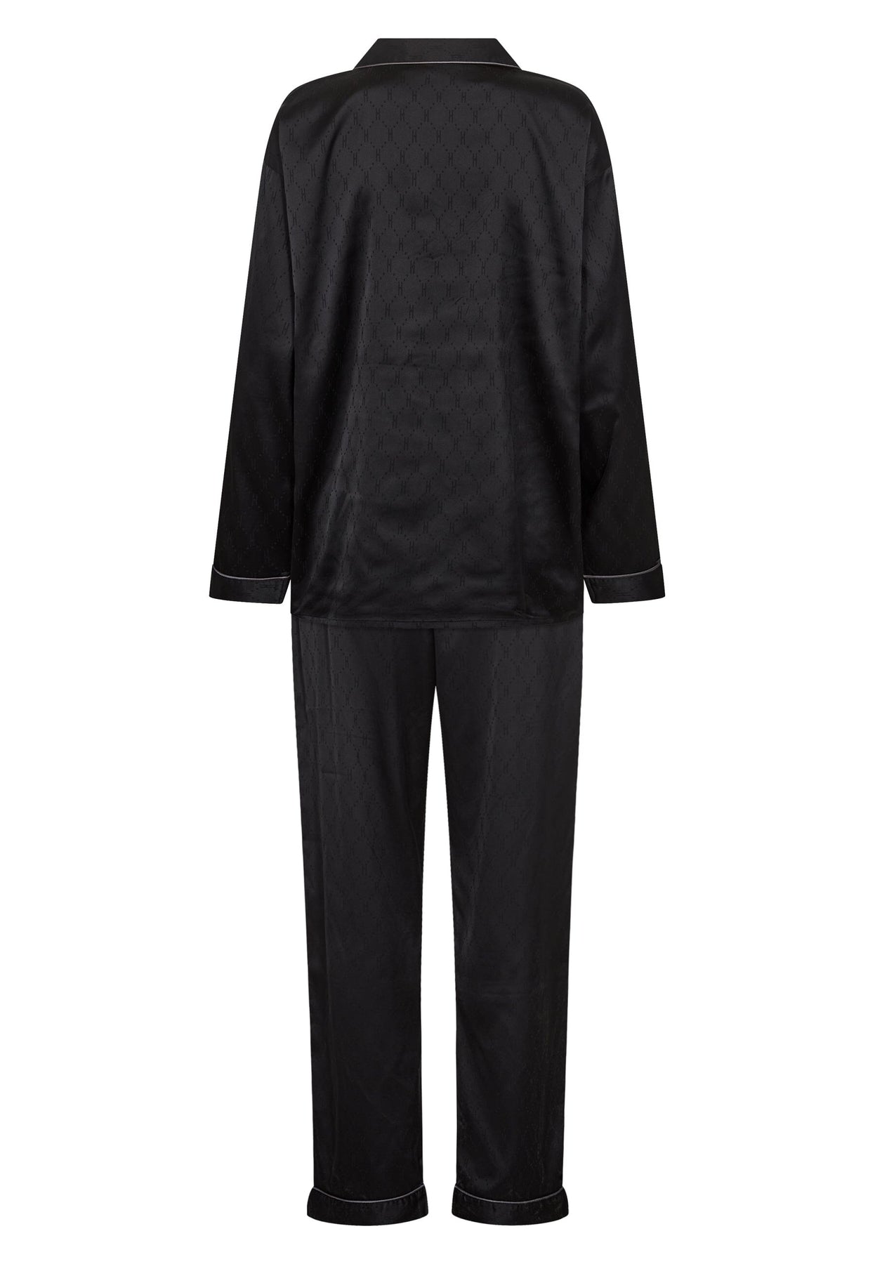 Zwarte satijnen pyjama's van Hype The Detail met een overhemdkraag en lange mouwen. De set heeft een strikband en decoratieve stiksels die een stijlvolle uitstraling geven.