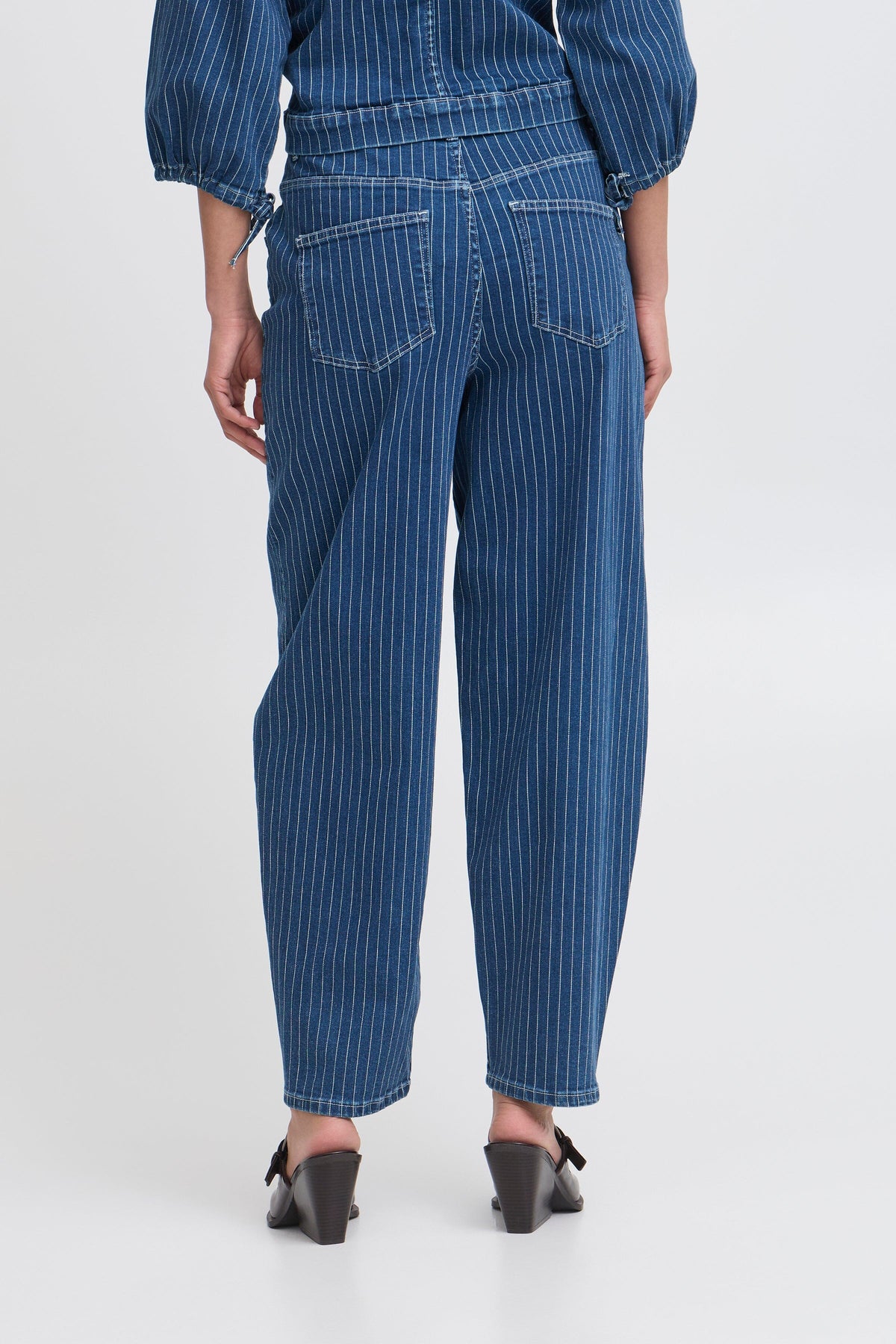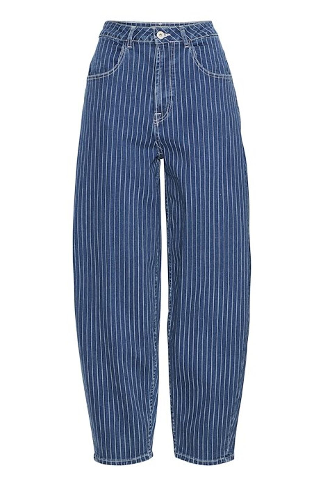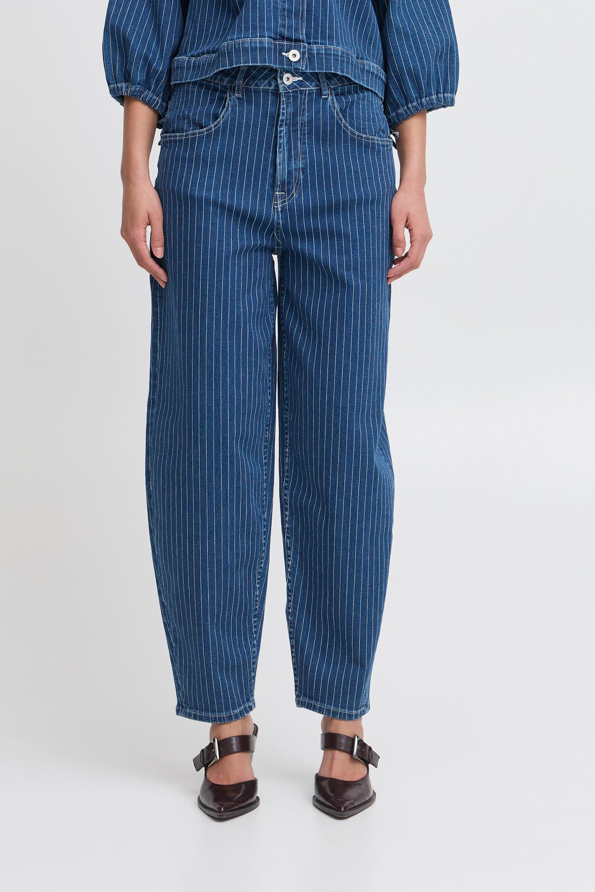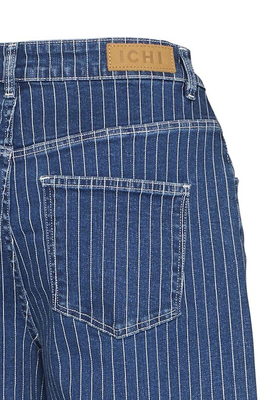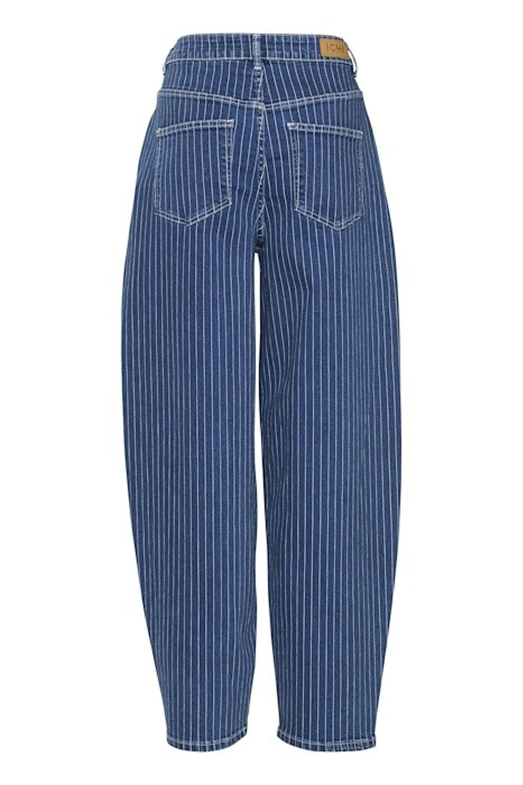 Gestreepte broeken van Ichi in middelblauwe denim met verticale strepen. De broeken hebben een hoge taille en een enkel lengte met een regular fit. Sluiting met rits en knopen.