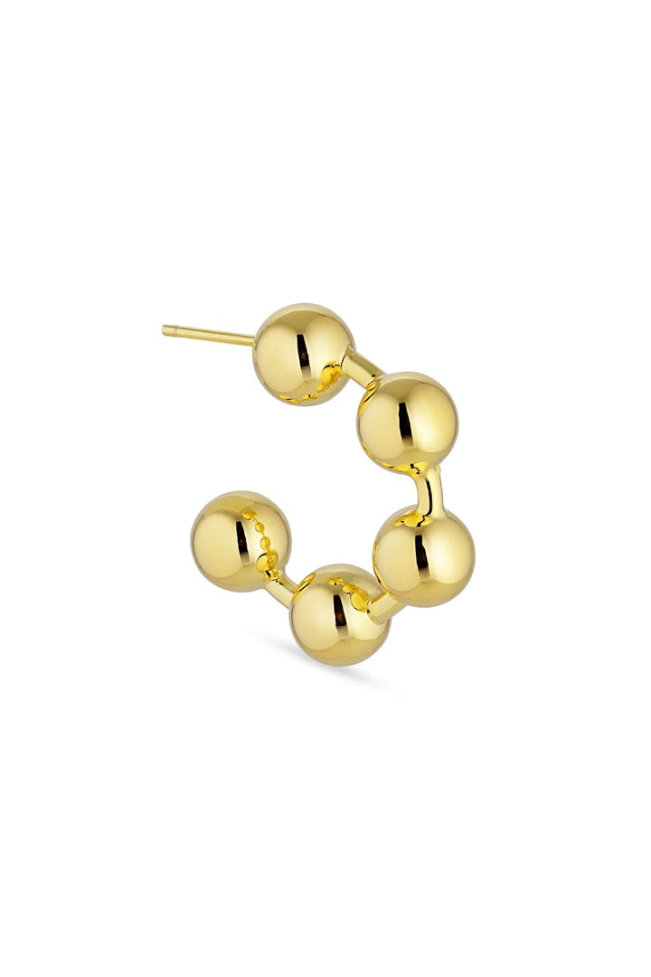Vergulde hoopoorbel van Jane Kønig met vijf verbonden bollen in een molecuulinspirerend ontwerp. De oorbel is gemaakt van sterling zilver met 18 karaat vergulding.