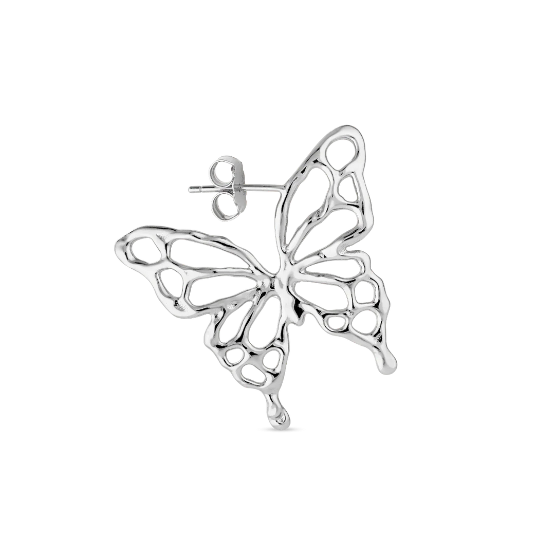 Zilverkleurige oorbel van Jane Kønig met een open vlindermotief. Hij is gemaakt van sterling zilver en heeft een licht ontwerp met fijne details in de vleugels.