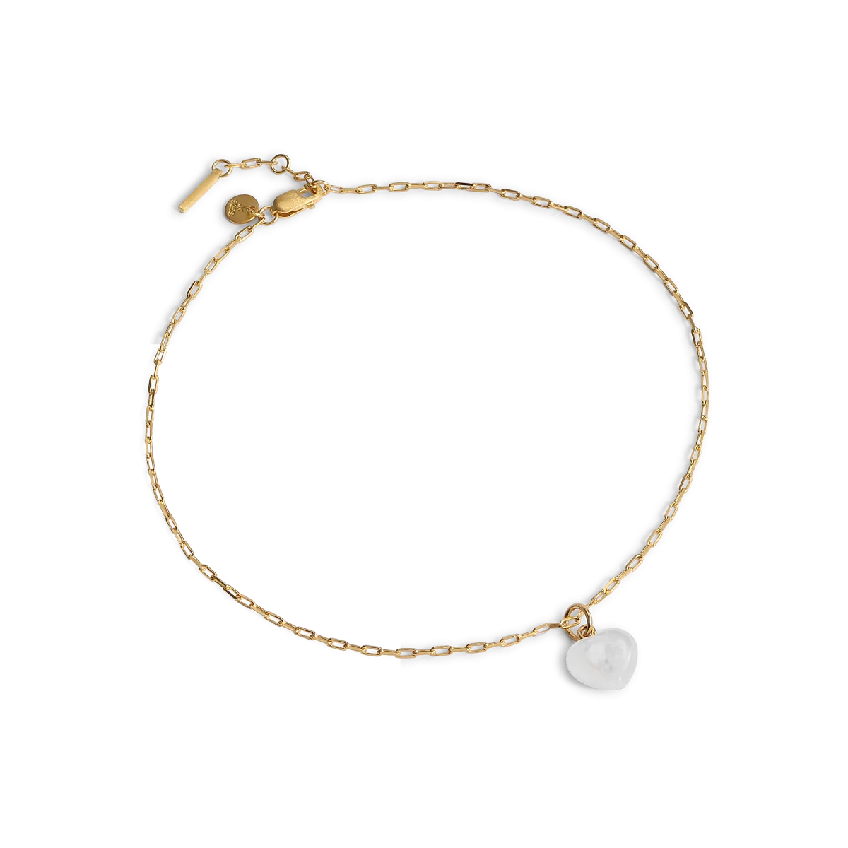 Hartvormige hanger van Jane Kønig in verguld sterling zilver met witte parelmoer. Een klein sieraad met een glanzend oppervlak dat op verschillende manieren kan worden gedragen.