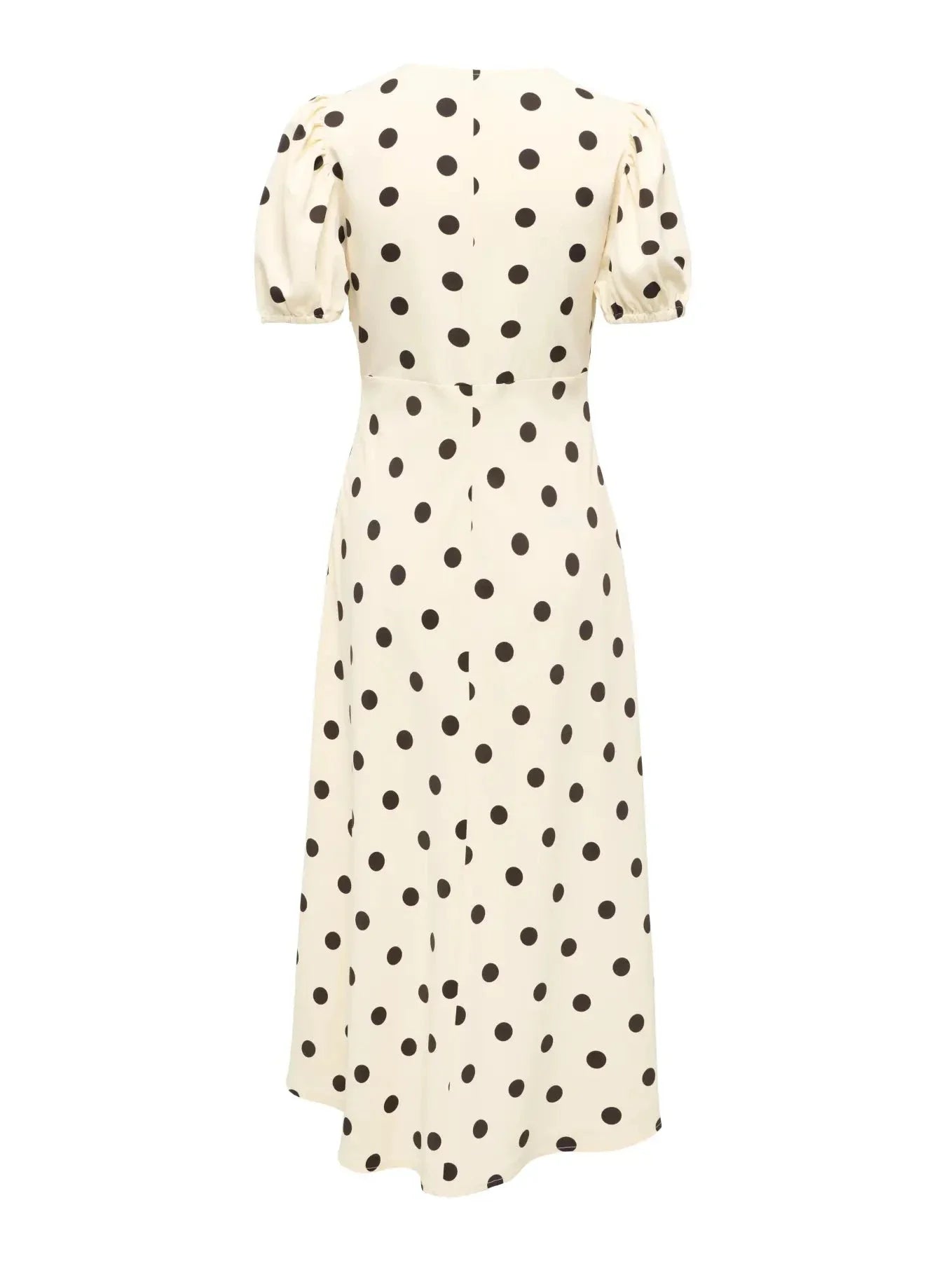 Midijurk van JDY in een lichte crèmekleurige tint met chocoladebruine stippen. De jurk heeft korte pofmouwen en een V-hals.
