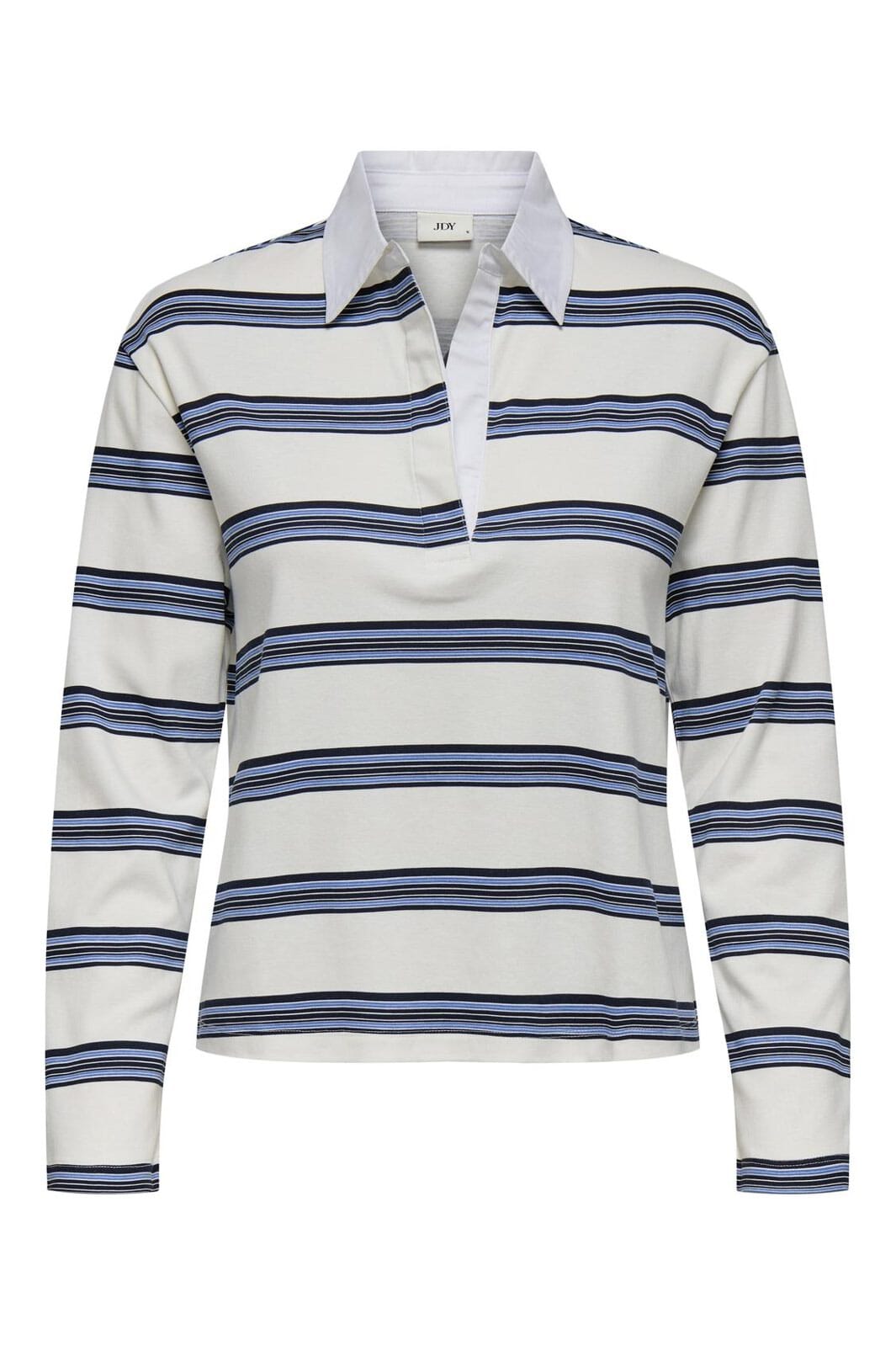 Gestreepte poloshirt van JDY met donkerblauwe en lichtblauwe strepen op een witte achtergrond. Het heeft een witte polokraag en lange mouwen, wat een klassieke uitstraling geeft.