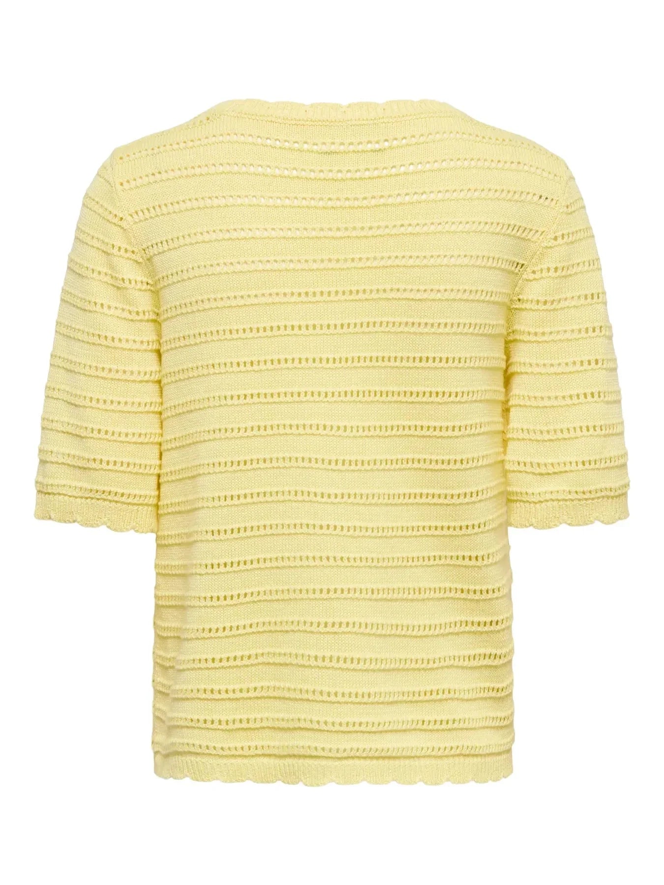 Lichtgele cardigan van JDY met V-hals en korte mouwen. De cardigan heeft een gestreepte structuur met pareldetails en knopen langs de voorkant.