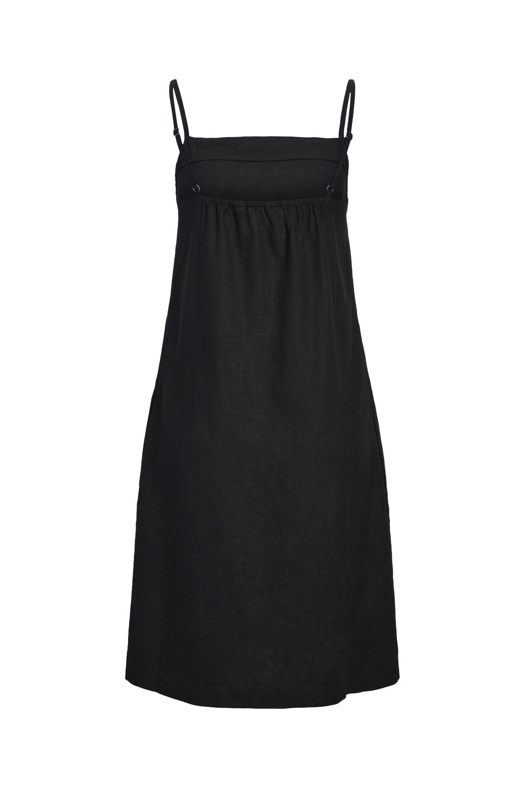 Zwarte zomerjurk van Jjxx met verstelbare spaghetti-bandjes en vierkante halslijn. De jurk heeft een losse pasvorm en is gemaakt van een mix van linnen en viscose.