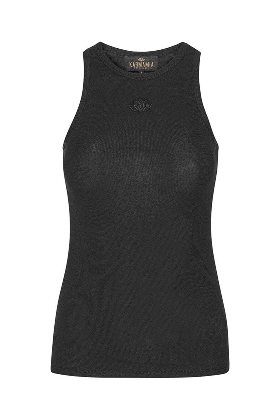 Zwarte tanktop van Karmamia met ronde halslijn. De top heeft een geborduurde lotusbloem op de voorkant en is gemaakt van Pima-katoen met stretch.
