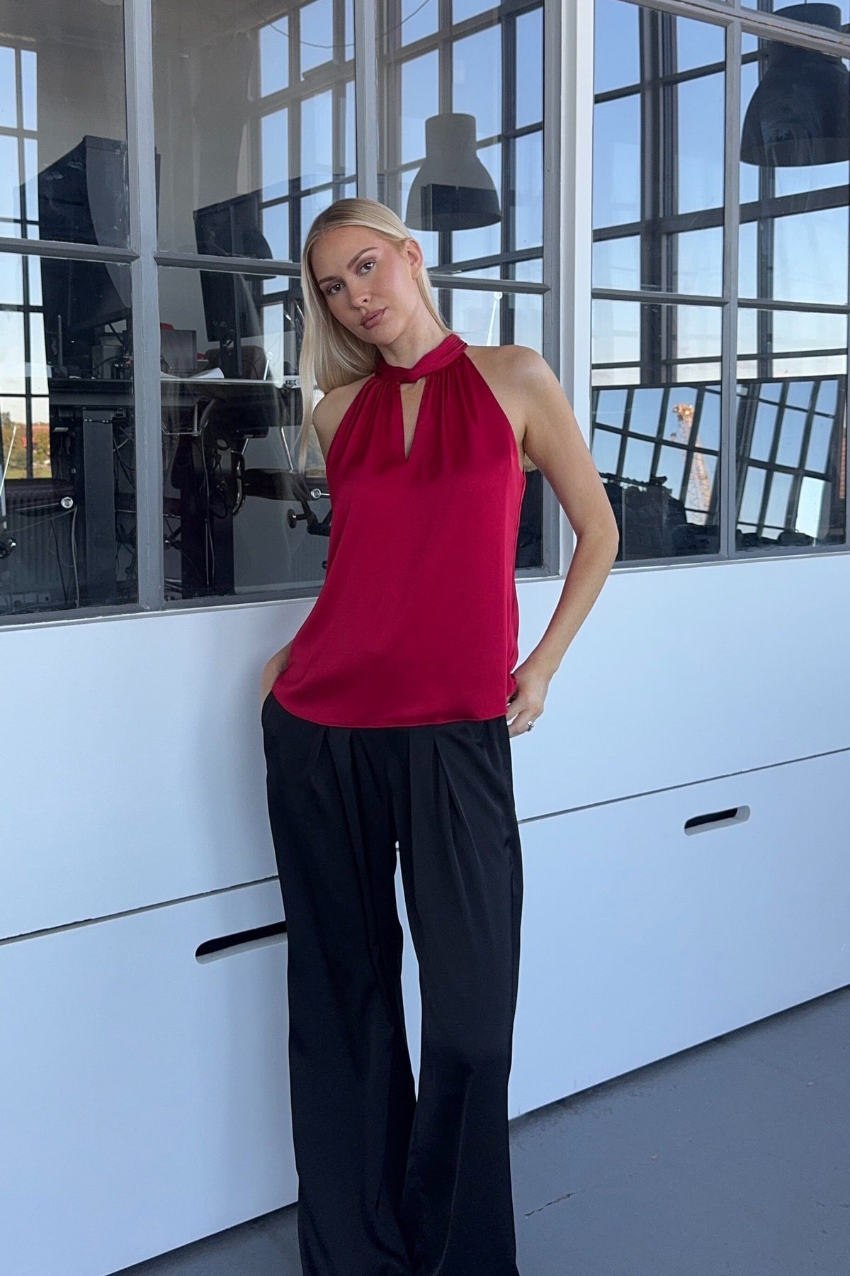 Rode top van Karmamia met hoge hals en ruchesdetails. De top heeft een diepe V-hals en een striksluiting bij de hals. Hij kan gestyled worden met de Savannah-rok of broeken.