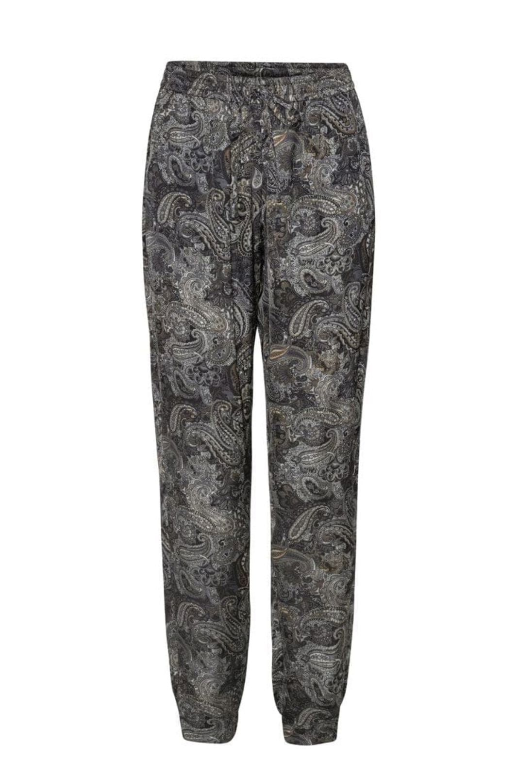 Broeken van Karmamia met paisleypatroon in grijs en zwarte tinten. De broeken hebben een elastische taille met een trekkoordsluiting en zijn enkel-lang.
