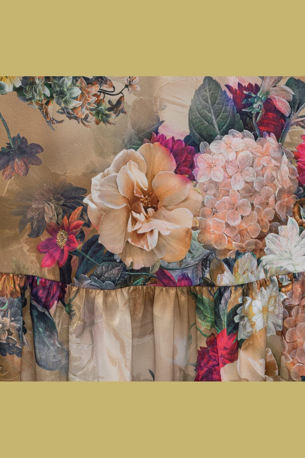 Lange rok van Karmamia met bloemenprint op een gouden achtergrond. De rok heeft ruches aan de zoom en een gelaagd design.