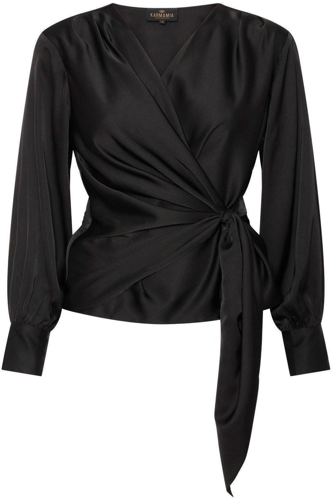 Zwarte satijnen blouse met wikkelontwerp en strikband in de taille. Het gladde oppervlak geeft de blouse een glanzende uitstraling, en de V-hals creëert een mooie halslijn.