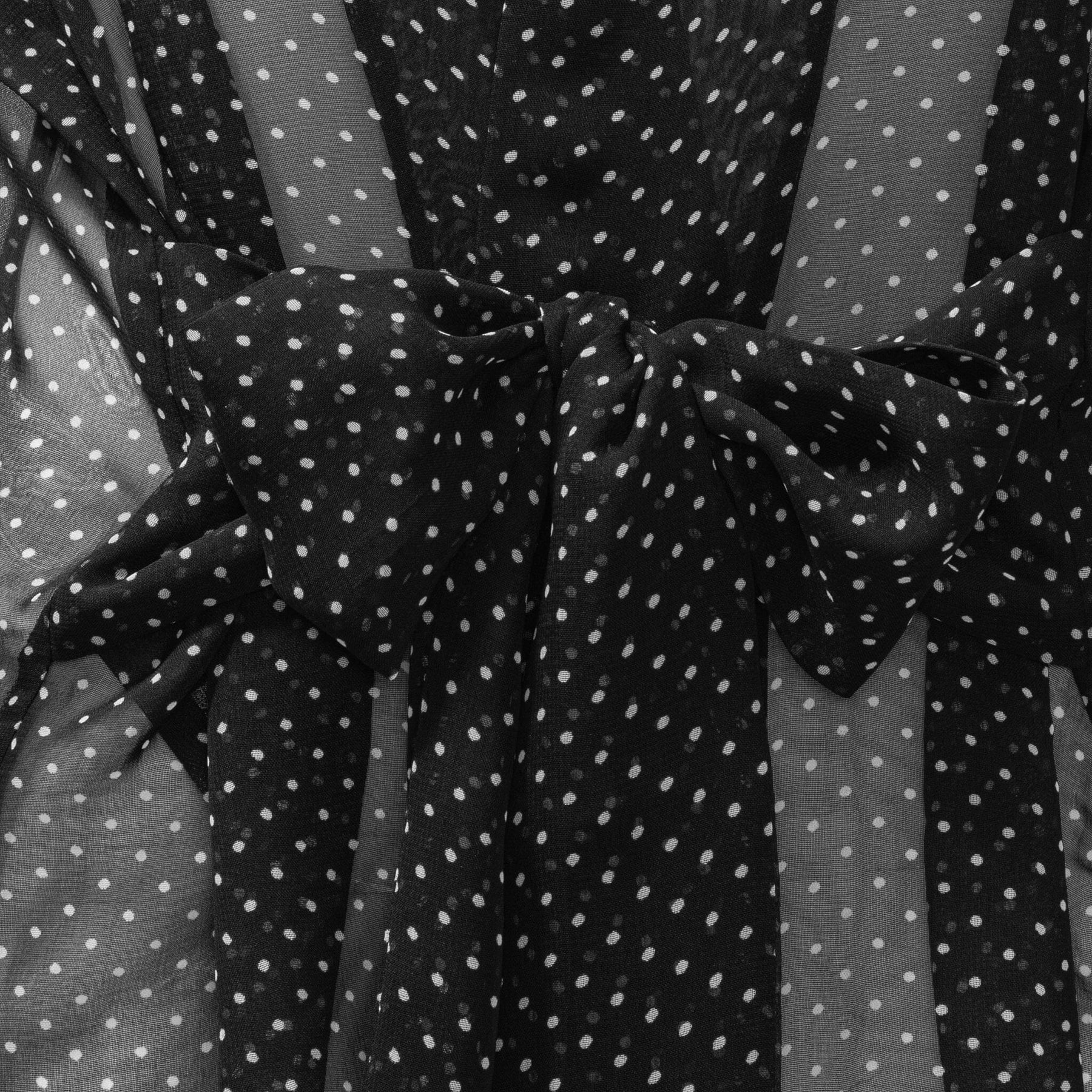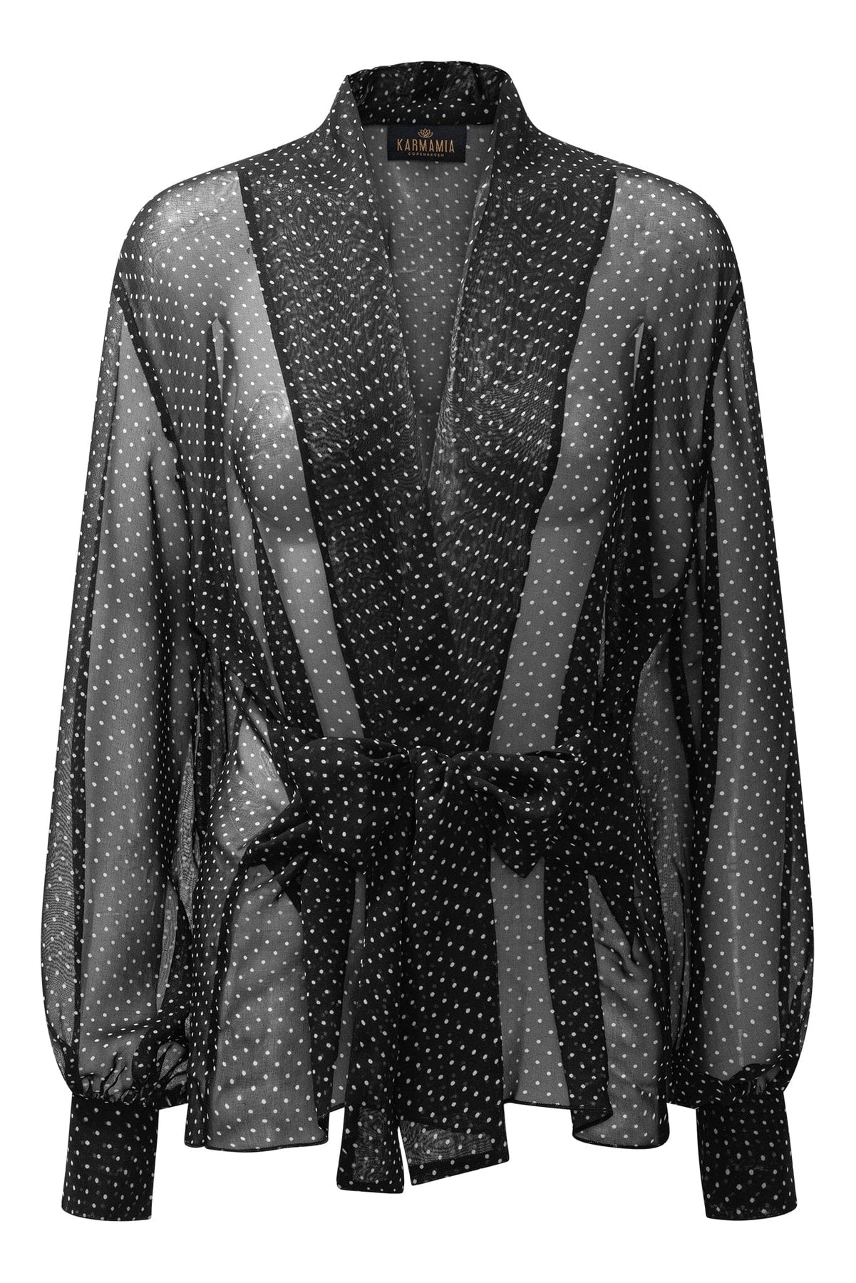 Zwarte wikkelblouse van Karmamia met witte stippen. De blouse is gemaakt van transparant meshmateriaal van 100% polyester en heeft een strikceintuur als sluiting.