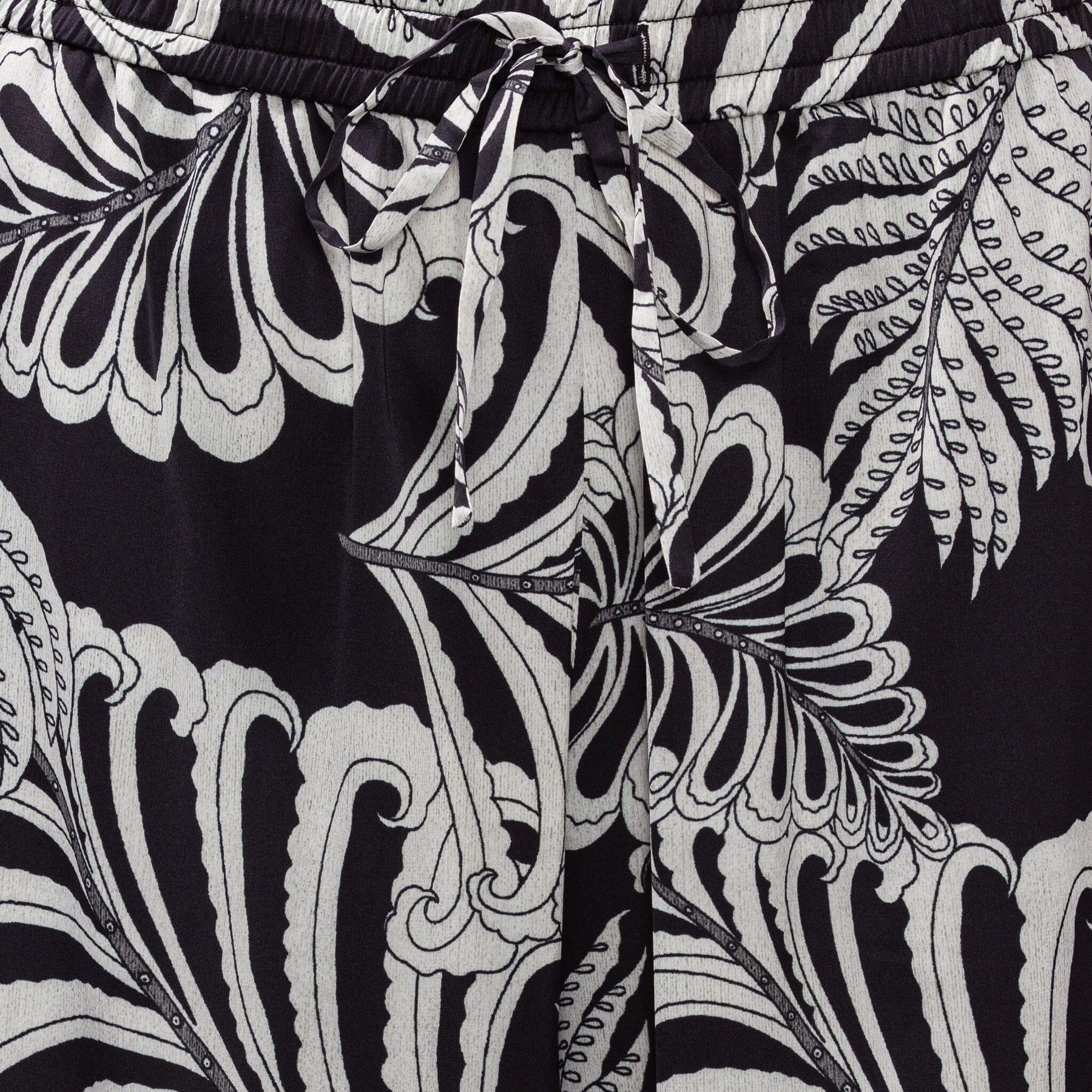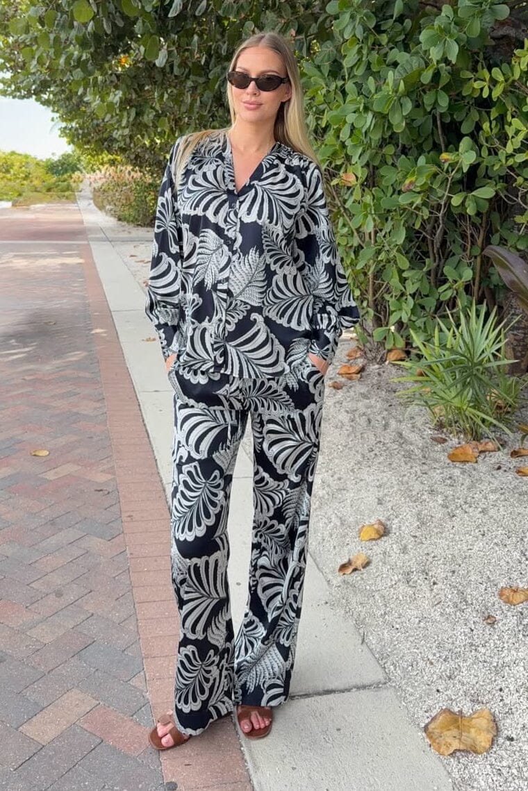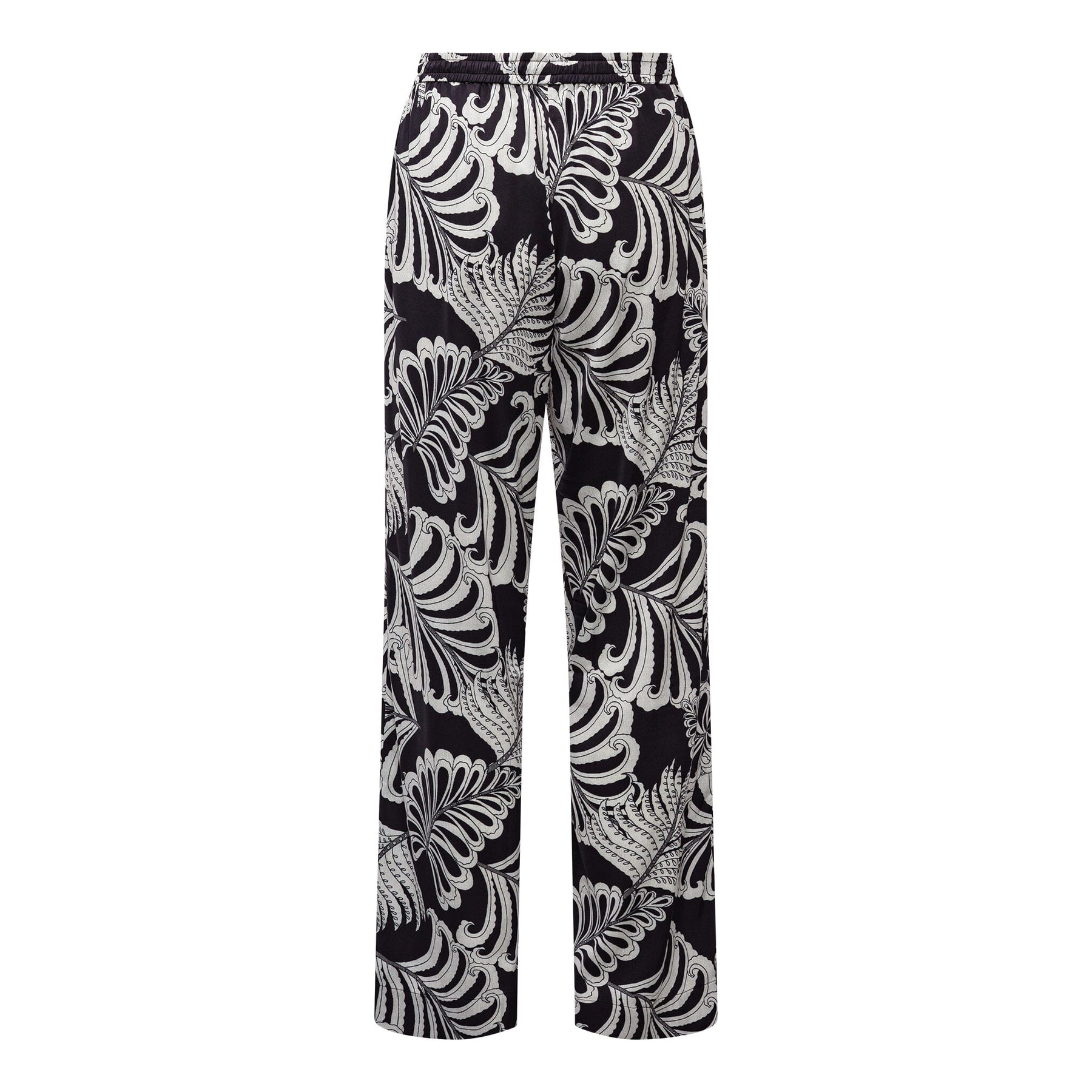 Broek van Karmamia met een donkerblauw en wit palmbladerenpatroon. De broek heeft rechte pijpen en een strikceintuur in de taille.