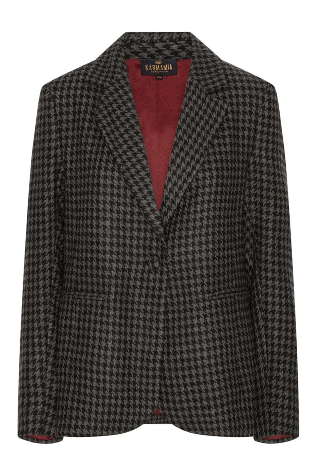 Blazer van Karmamia met zwart-wit houndstooth patroon. Het heeft een oversized pasvorm met overhemdkraag, praktische zakken en een rode binnenvoering.