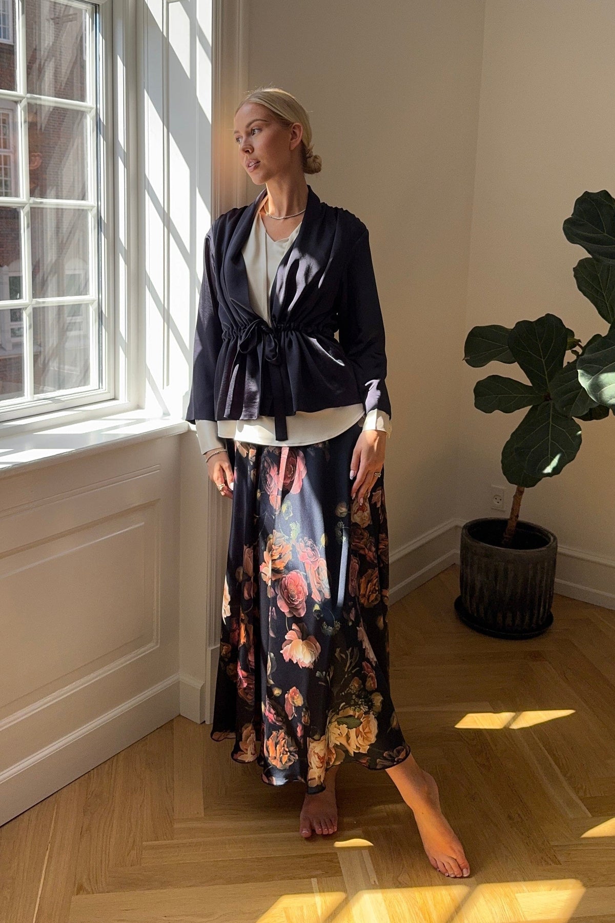 Zwarte rok van Karmamia met bloemenpatroon in roze, perzik en crème tinten. Hij heeft een hoge taille en komt tot halverwege de kuit. De stof valt soepel en heeft een gladde afwerking.