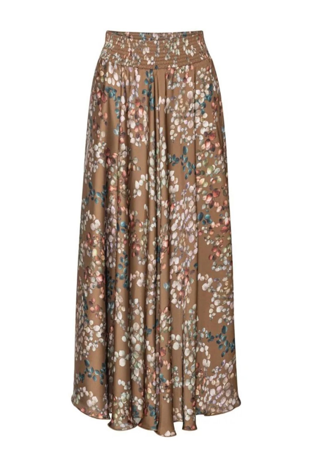 Bruine rok van Karmamia met bloemenpatroon in warme tinten. De stof heeft een zachte val met details in roze, groen en blauw op de bruine achtergrond.
