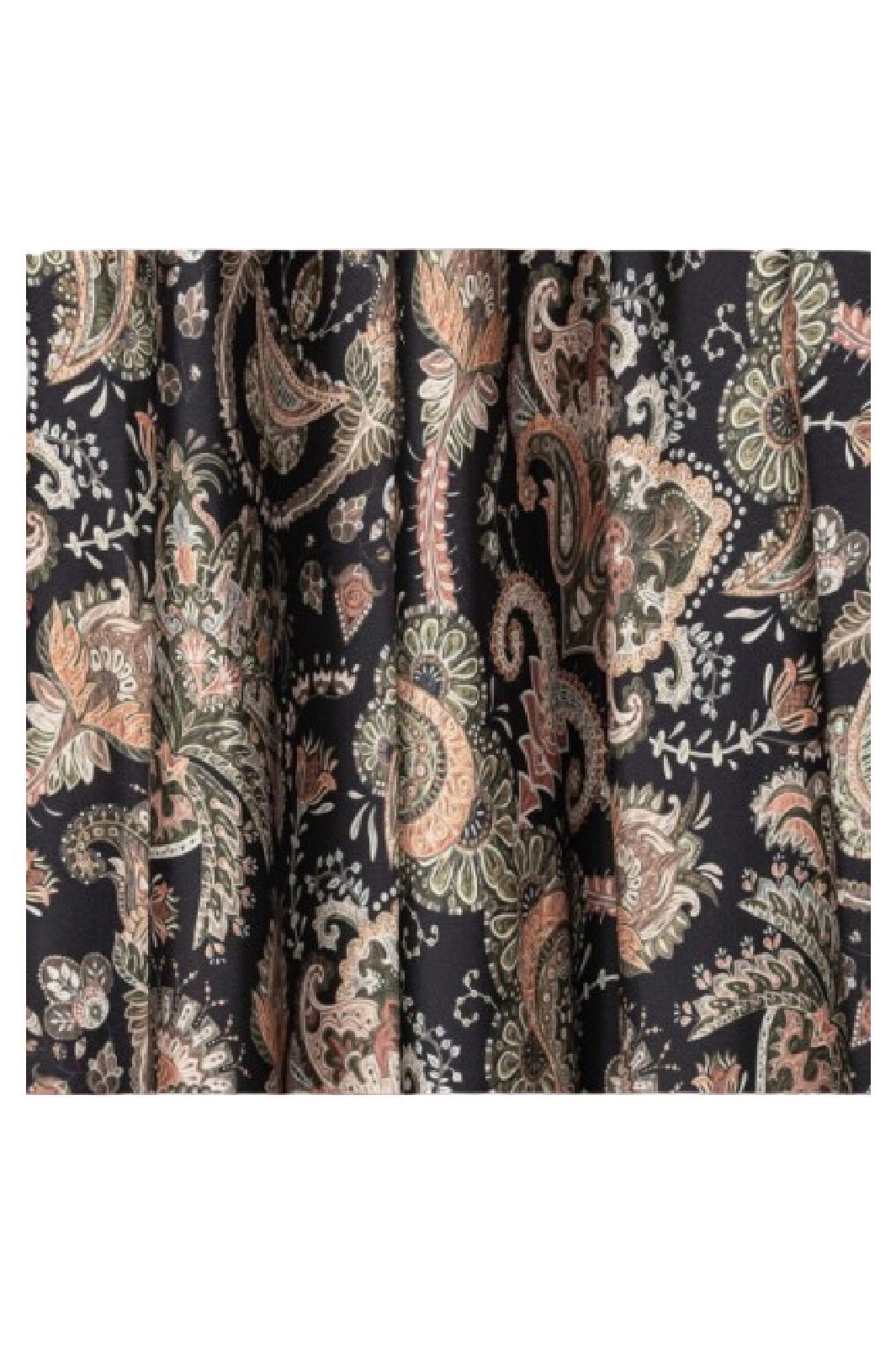 Lange rok van Karmamia met paisleymotief in khaki, groen en zwart. De rok heeft een hoge taille en een vloeiende snit met volantdetails.