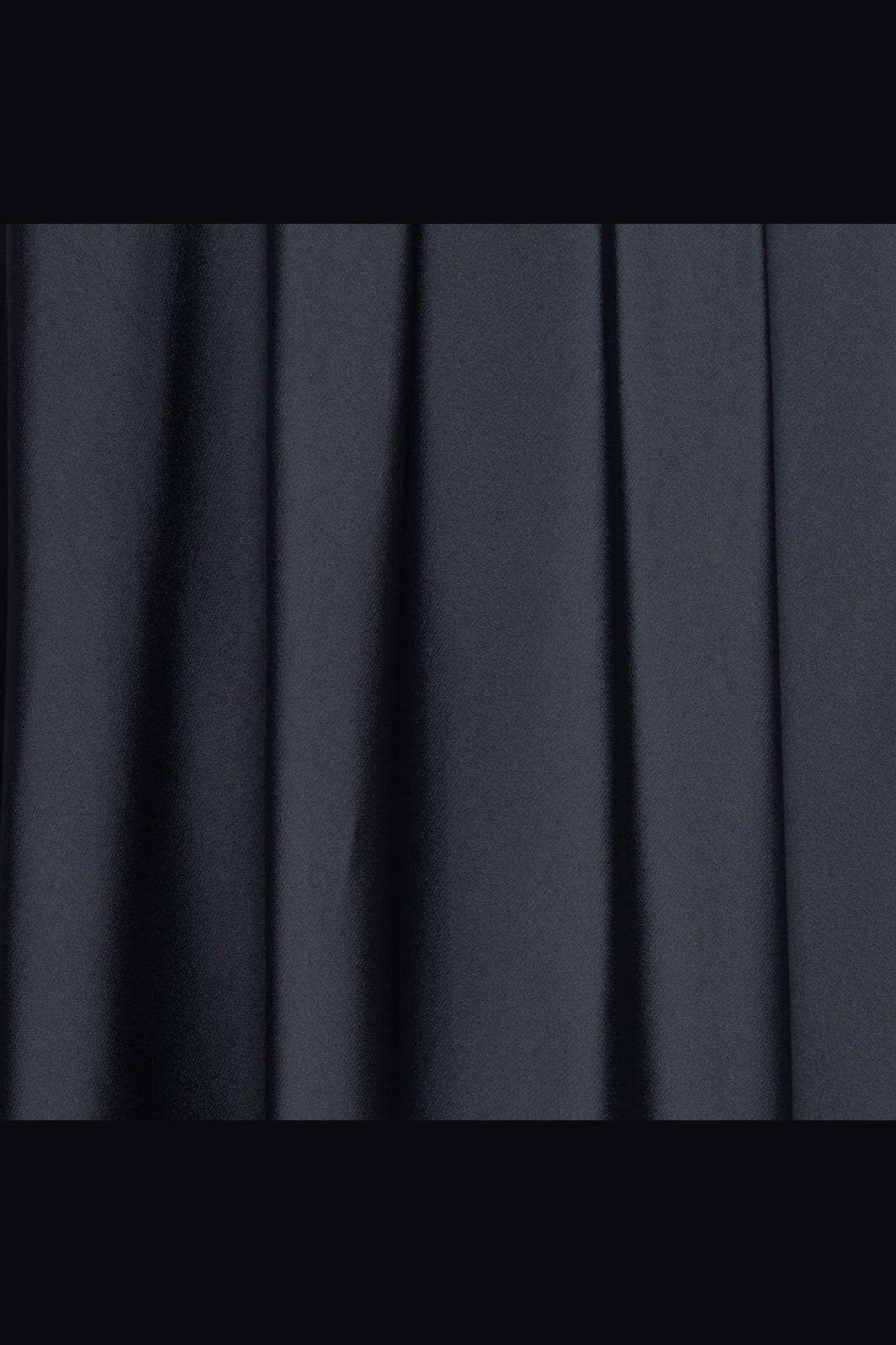 Donkerblau rokje van Karmamia in glanzend satijn. Het heeft een hoge taille met gerimpelde elastiek en valt losjes tot de kuiten met zachte plooien.