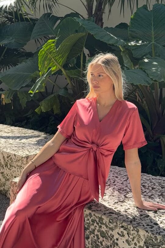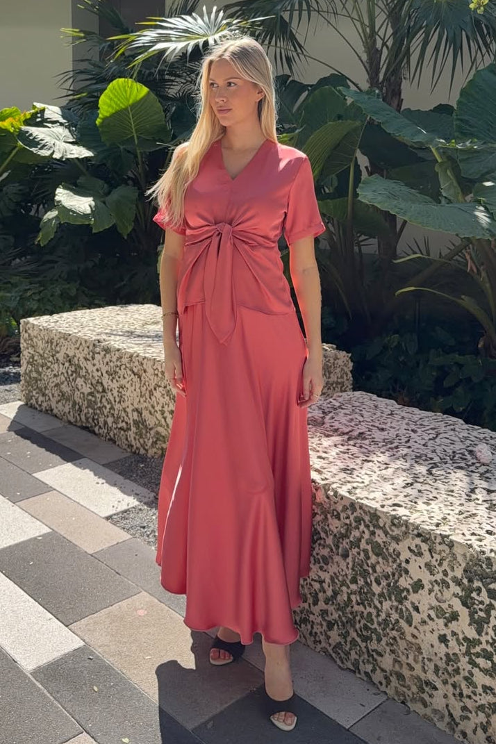 Koraalroze rok van Karmamia, gemaakt van semirijke satinstof met een losse snit en enkellengte.